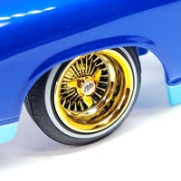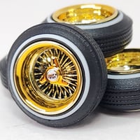 Set of four gold plated 1:24-1:25 scale 13 inch straight lace spoke wheels with rubber whitewall tires. These are quite strong with a soft rubber tire and will hold up pretty well in the hopper scene. 2 knock off options available. Back side of wheels are not plated. Please use drop down menu to make selection.