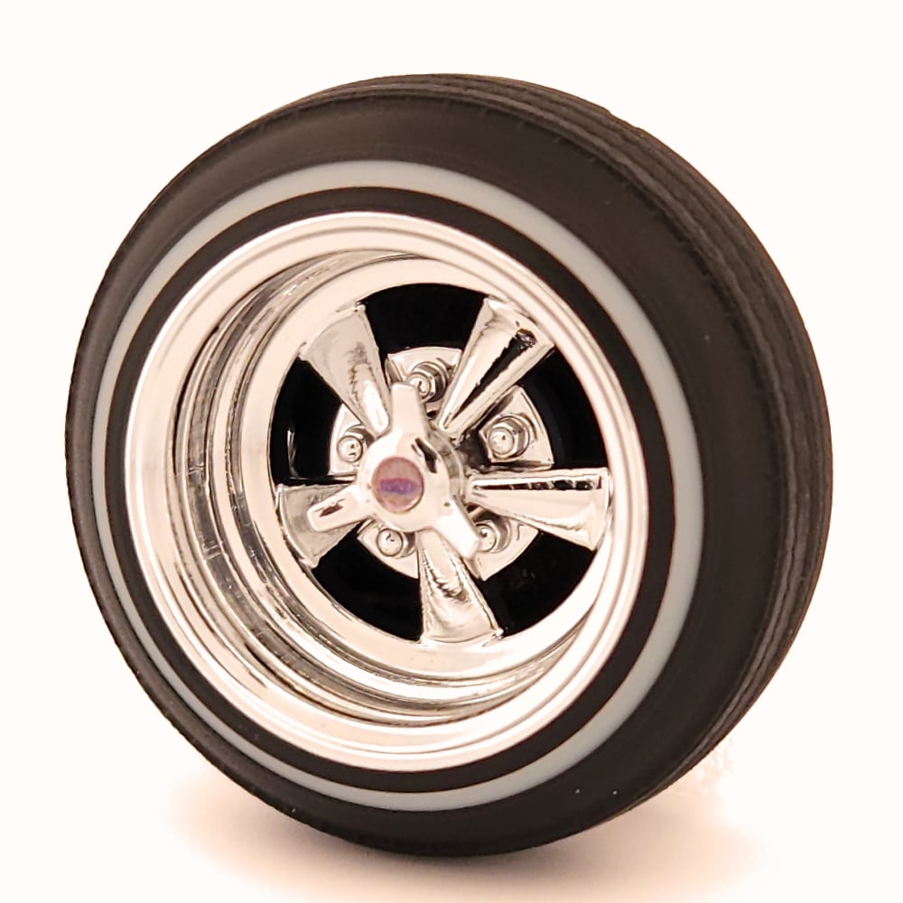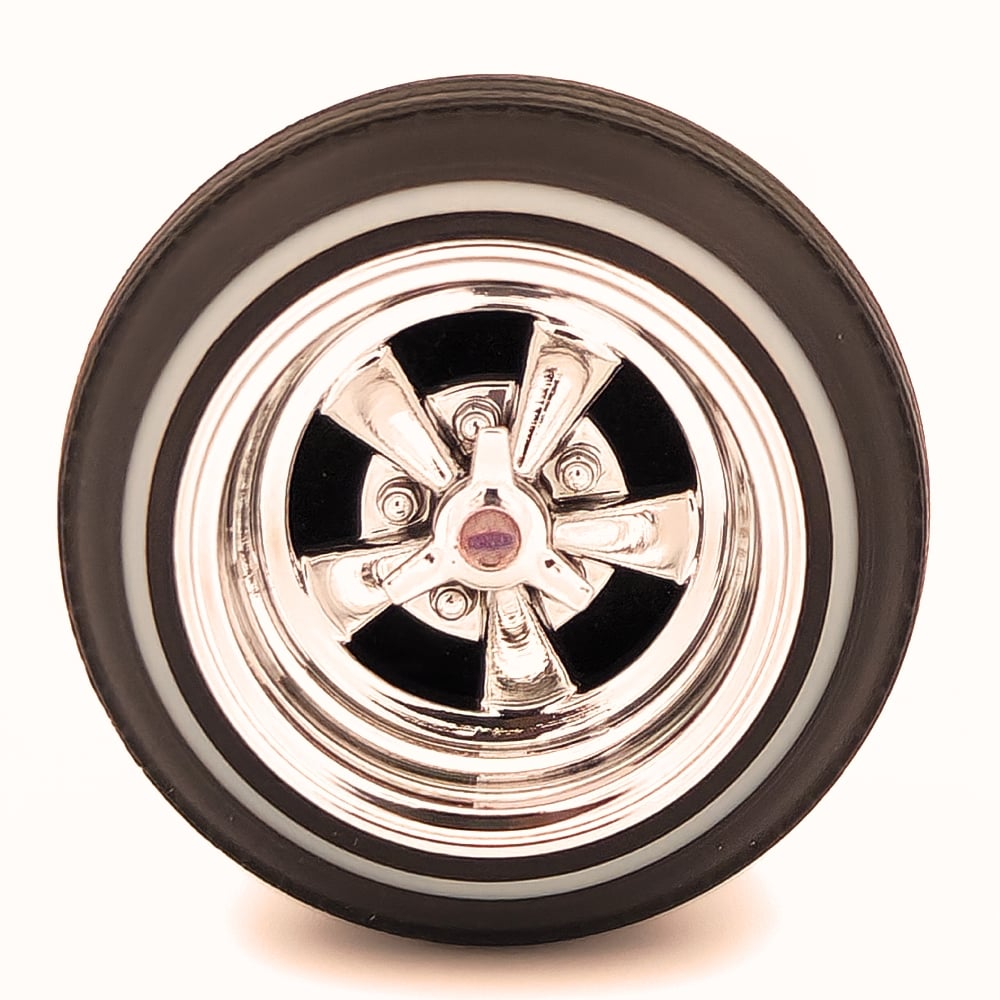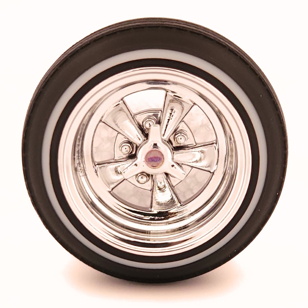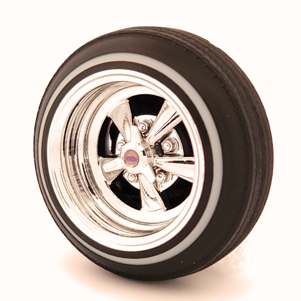 Set of four 14 inch 1:24-1:25 scale chrome plated wheels wrapped in rubber whitewall tires. Available with round cap or 3 bar knock off. Free die cut water slide chip decals are included. Back side of wheels are not plated. Please use the drop down menu to make selection.