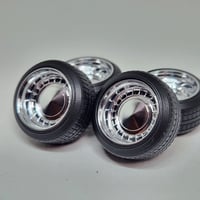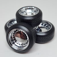 Chrome plated 1:25 scale 15 inch KMC78's wrapped in black resin tires. Perfect for those mini truck and Samurai builds. Available in sets of 4 or 5. Back side of wheels are not plated. Please use drop down menu to make selection.
