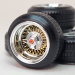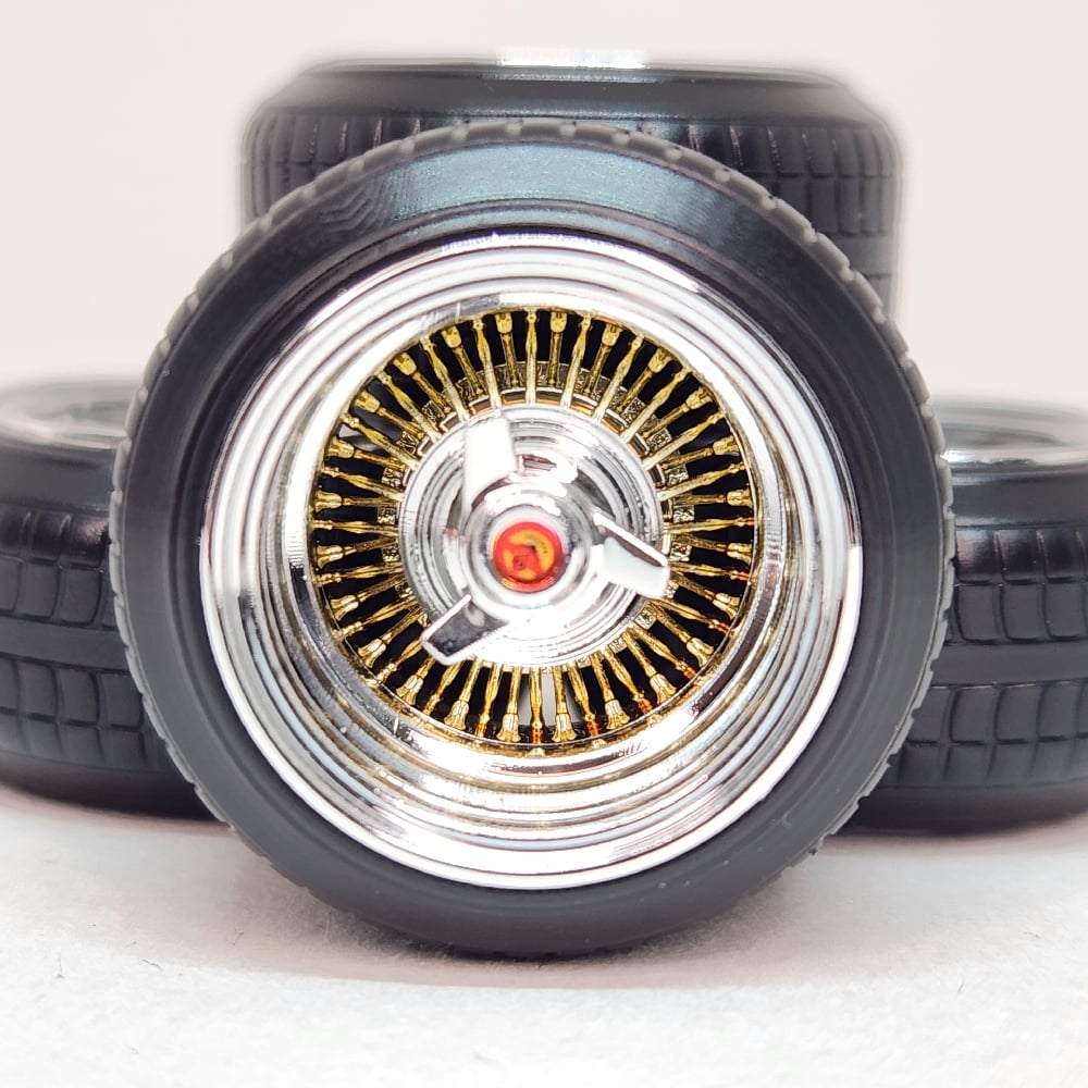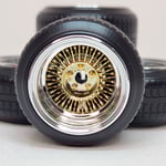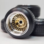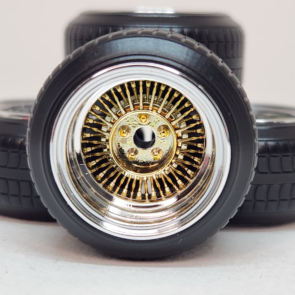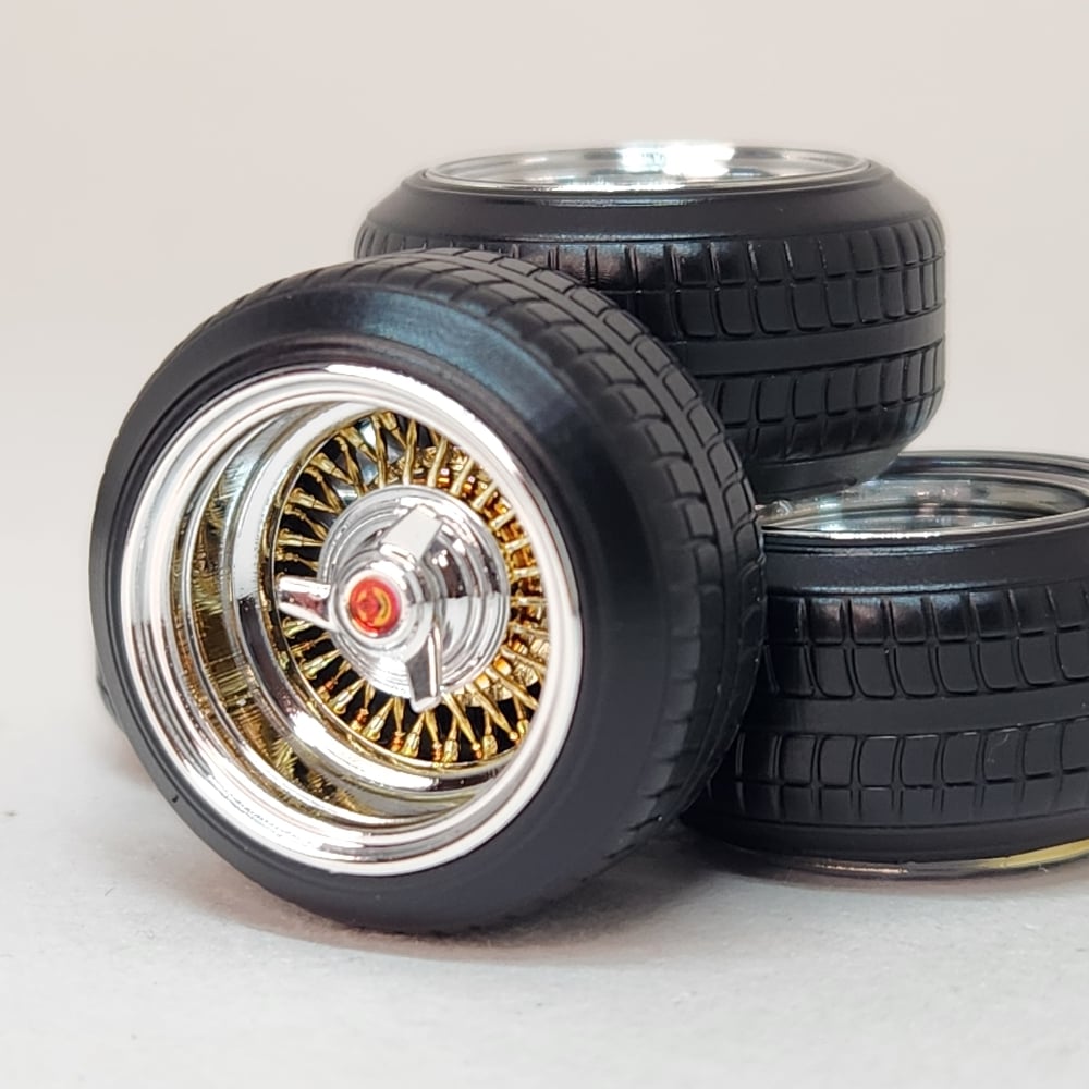 Set of chrome plated 1:25 scale 15 inch bolt on style straight lace spokes with 3 bar knock off wrapped in plastic tires. Perfect for minitruck, euro or Samurai builds. Free die cut water slide chip decals included. Available in sets of 4 or 5, as well as chrome or 2 tone. 2 tone version has a removeable cap. Please use drop down menu to make selection. Back sides of wheels are not plated.