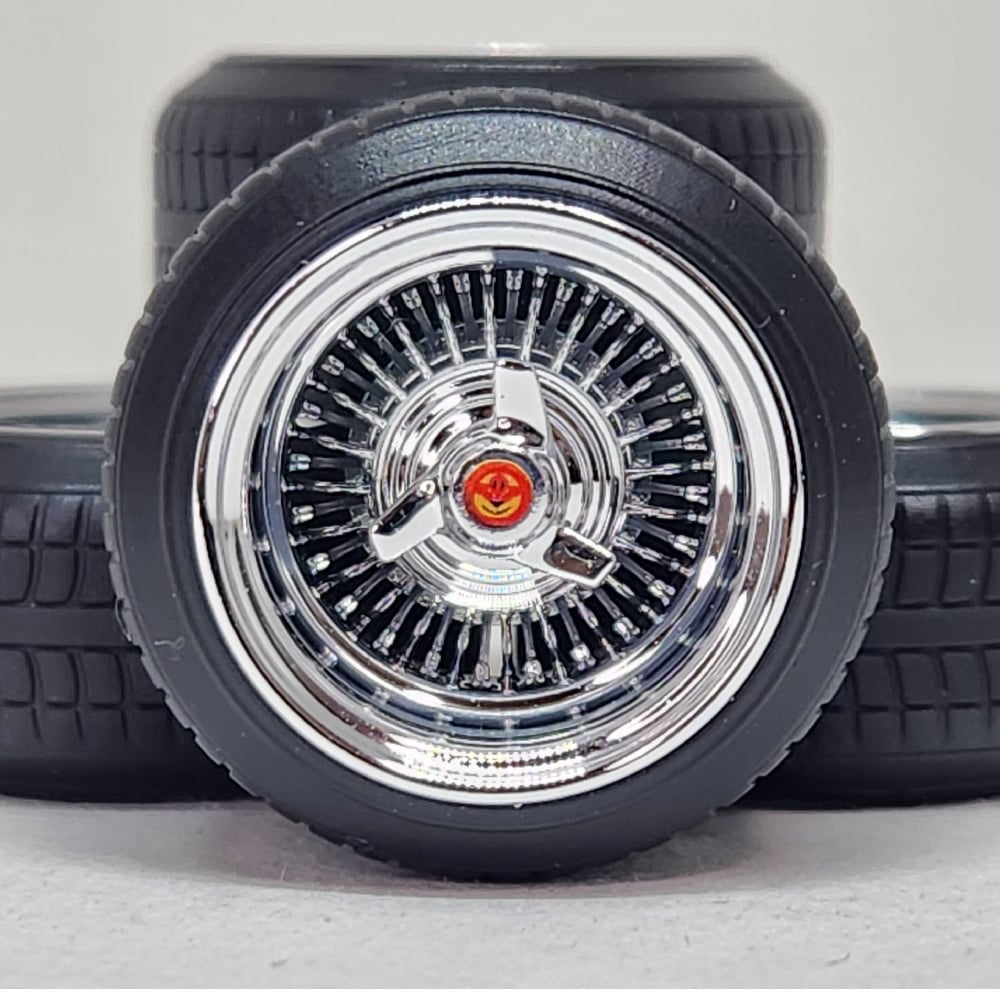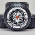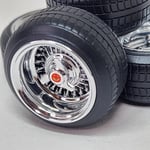 Set of chrome plated 1:25 scale 15 inch bolt on style straight lace spokes with 3 bar knock off wrapped in plastic tires. Perfect for minitruck, euro or Samurai builds. Free die cut water slide chip decals included. Available in sets of 4 or 5. Please use drop down menu to make selection. Back sides of wheels are not plated.