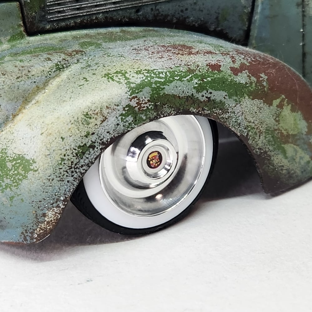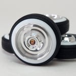 Set of four 1:25 scale aluminum Sombrero wheels wrapped in our new rubber wide whitewall tires. Wheels will need to be polished. Free die cut water slide chip decals included. White section of tires were made with a chemical to prevent yellowing over time. ***POLISHING TIPS*** We highly recommend using a cone shaped stiff polishing bit (see last picture in this listing) on the end of a rotary tool with a generous amount of metal polish. These are made of a soft, easy to polish aluminum, however due to the contours and shape of this wheel hand polishing is not recommended. After polishing, coat with an automotive wax to prevent tarnishing over time.