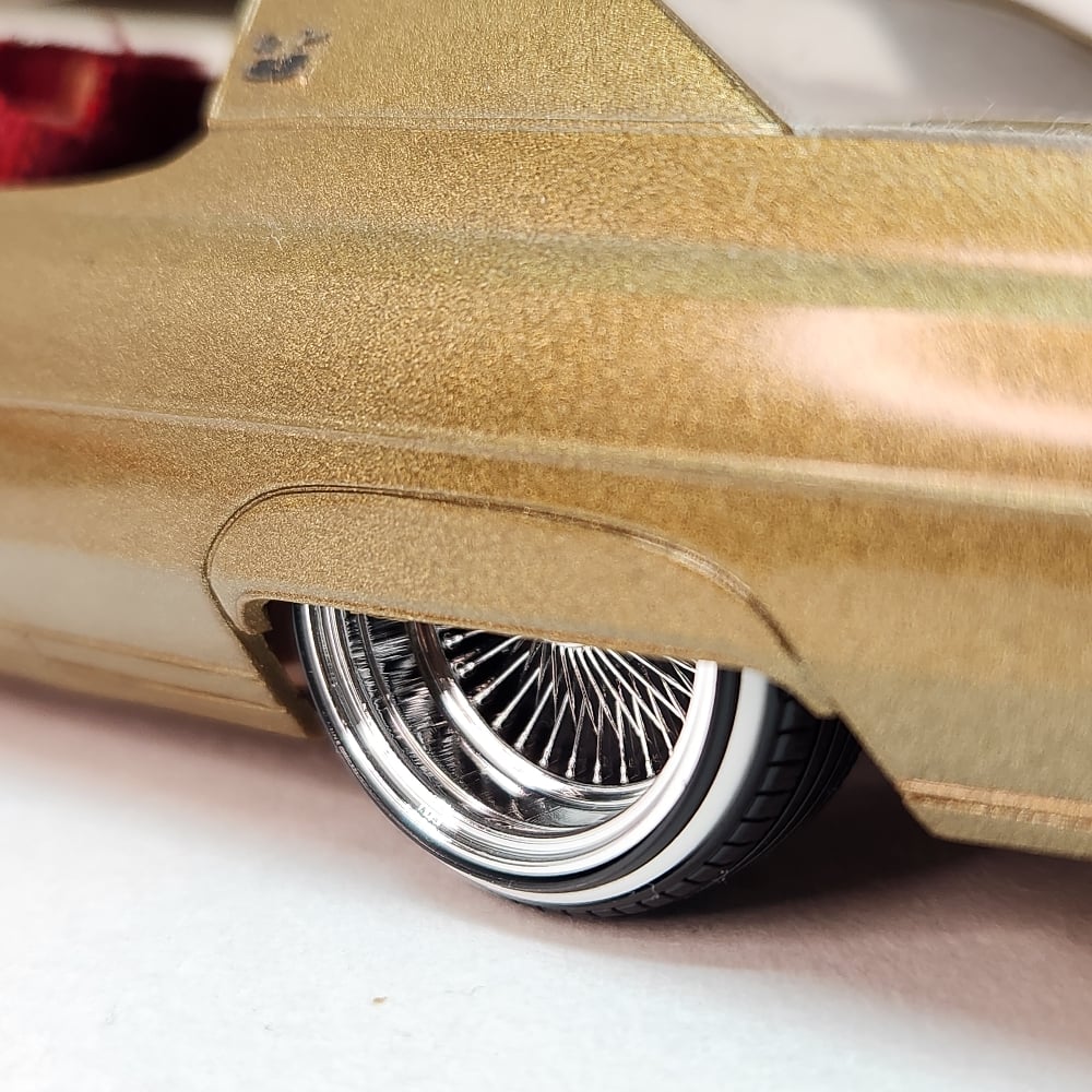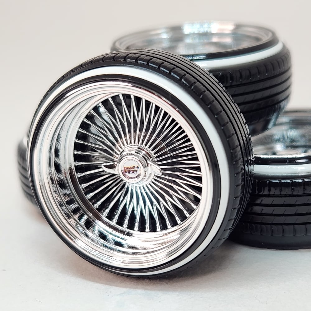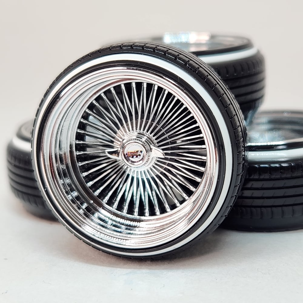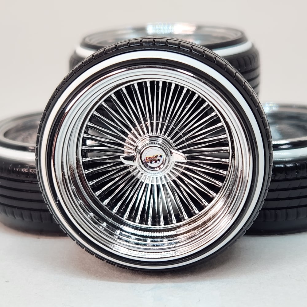 1:20 scale 17 inch chrome plated straight lace spokes with plastic whitewall tires. Might be able to use them as a 1:25 scale 22 inch but theyre a bit too wide for scale. Dimensions are as follows: rim OD 23.9mm. Tire OD 29.4mm. Width 13.2mm. Free die cut water slide chip decals included. Back sides of rims are not plated. Brown car in photos is 1:25.