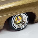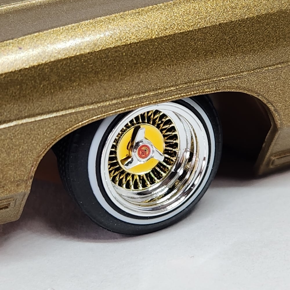Set of 4 1:25 scale 13 inch plated spoke wheels with rubber 520 tires. Available in all chrome, 2 tone or all gold. 2 tone come with both chrome and gold knock offs. All sets include free die cut water slide chip decals. Please use drop down menu to make selection.