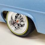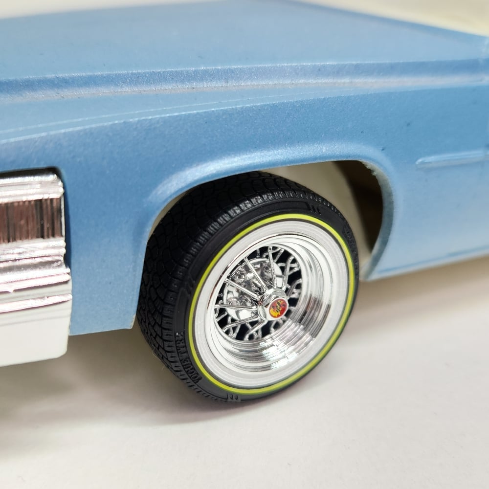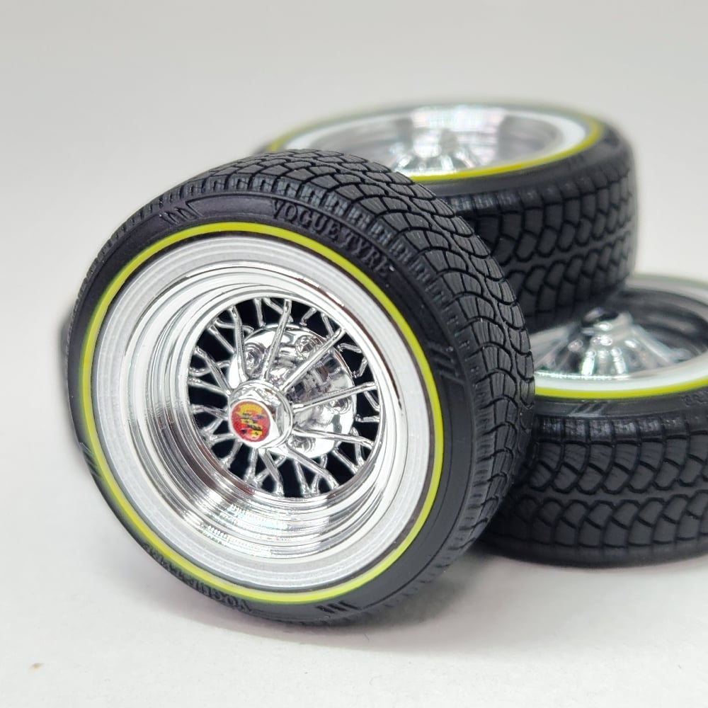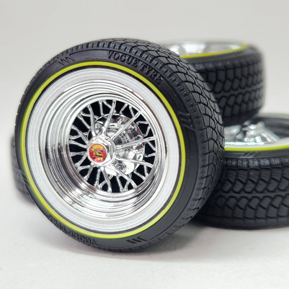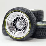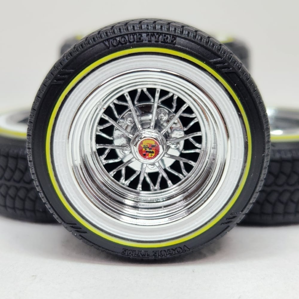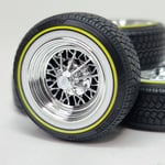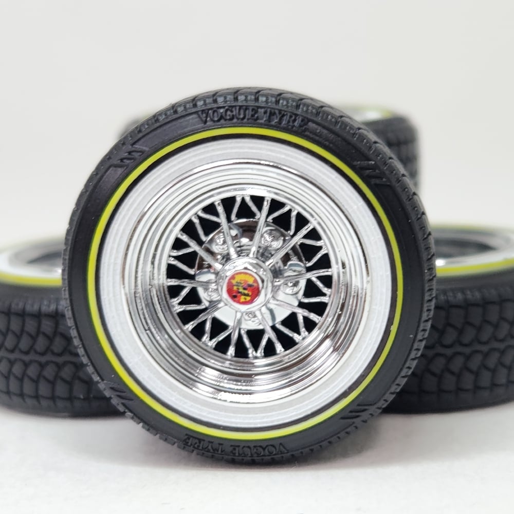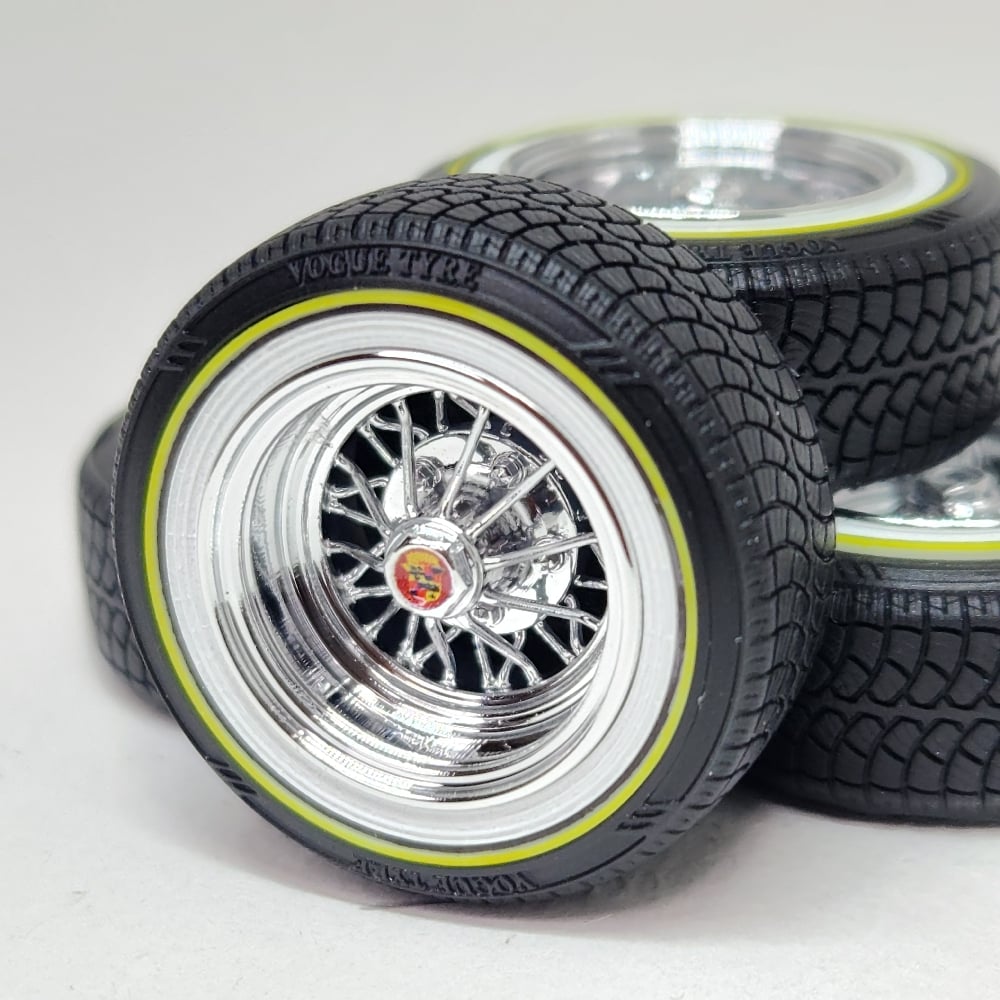 Set of 4 chrome plated 1:24-1:25 scale 15 inch 30 spoke wheels with printed "V" style tires. Available in shallow or deep dish. Tires are printed in black and sprayed with a semi gloss clear coat. Whitewall is printed in white and sprayed with a durable semi gloss white lacquer. Yelllow is applied as well. You get exactly what you see in the picutres. 2 sets of free die cut water slide decals included. Back sides of tires and rims are not finished. Some glue may be required to hold outer tire in place.