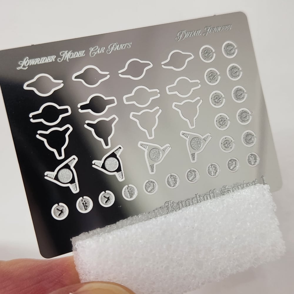 Set of 1:24-1:25 scale photo etch knock offs and chips. Made of polished stainless steel.