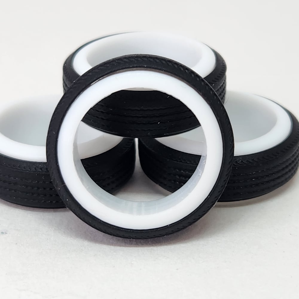 Set of four 1:24-1:25 scale whitewall tires. These can be used on any wheel from 17mm to around 19mm (15 to 17 inch). Perfect for bombs, hot rods, vintage builds etc. There is a back side and a front side. Please check before mounting as its a bit difficult to detect. Note also these will not fit any of my previous wheels.