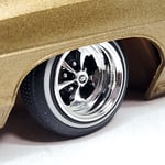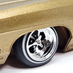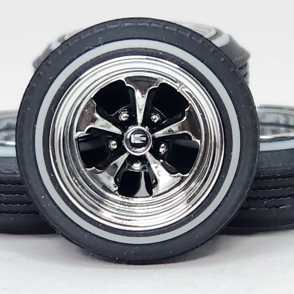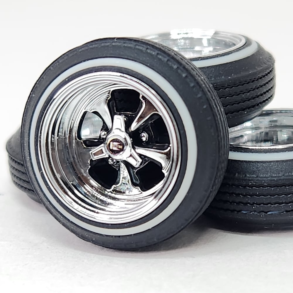 Set of four 1:24-1:25 scale 14 inch chrome plated wheels with rubber 520 whitewall tires. Free die cut water slide decals for the center cap included. Available with round cap or 3 bar knock off. Back side of wheels are not plated. Please use the drop down menu to make selection.