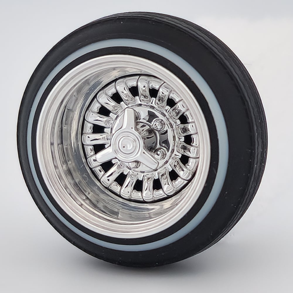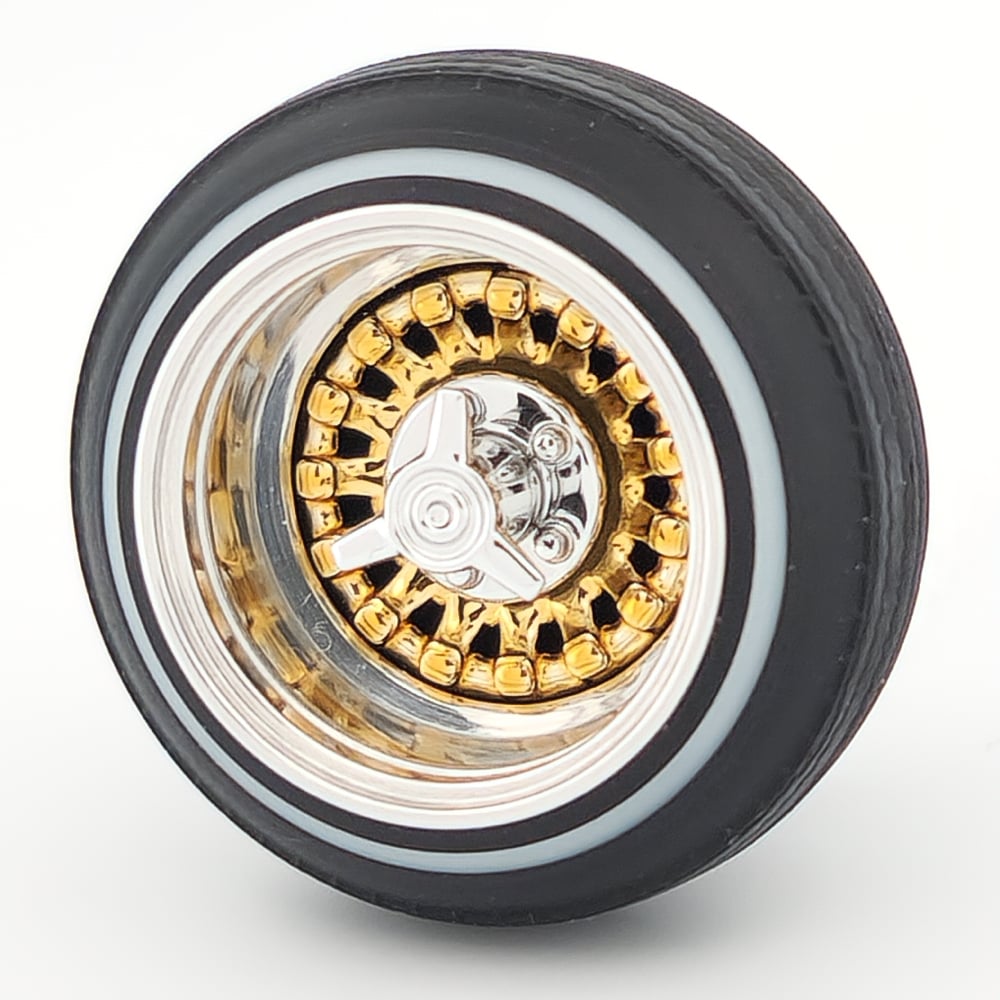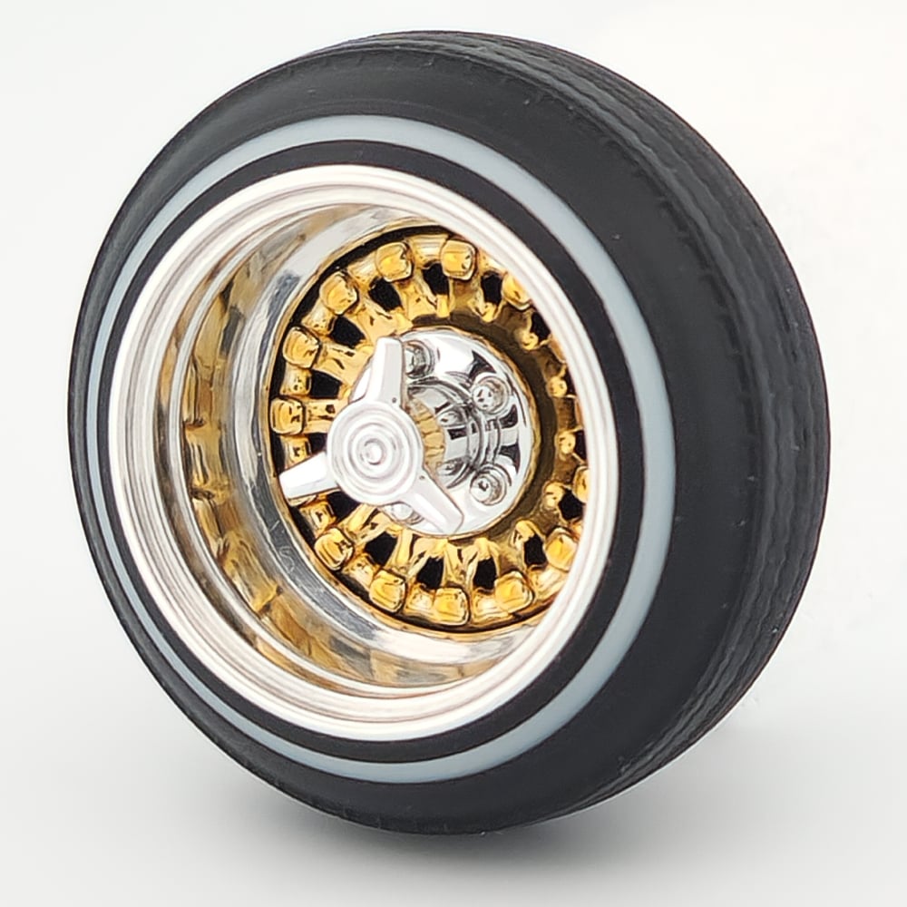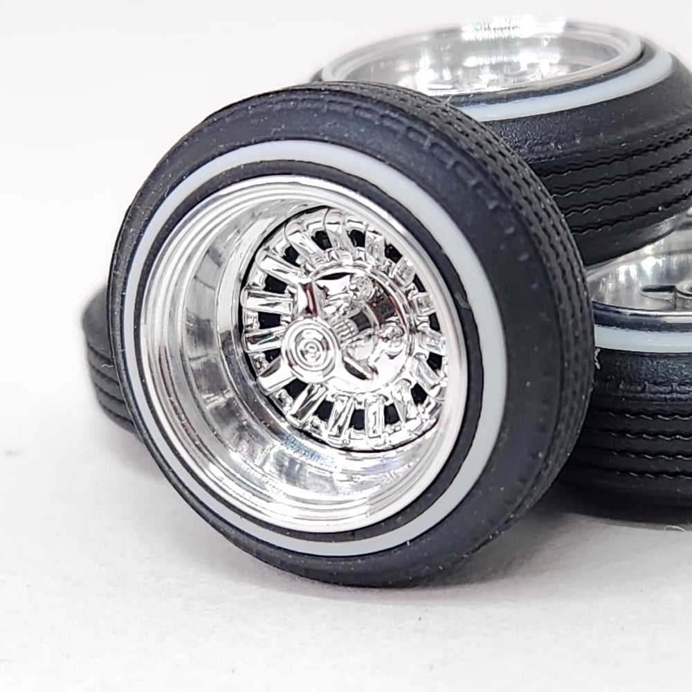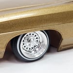 Set of four 14 inch 1:24-1:25 scale wheels with rubber 520 tires. Rims are aluminum and will require polishing by you. Available in all chrome or with gold center. Please use drop down menu to make selection.