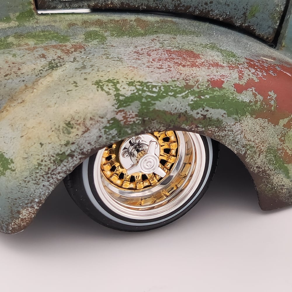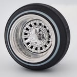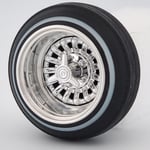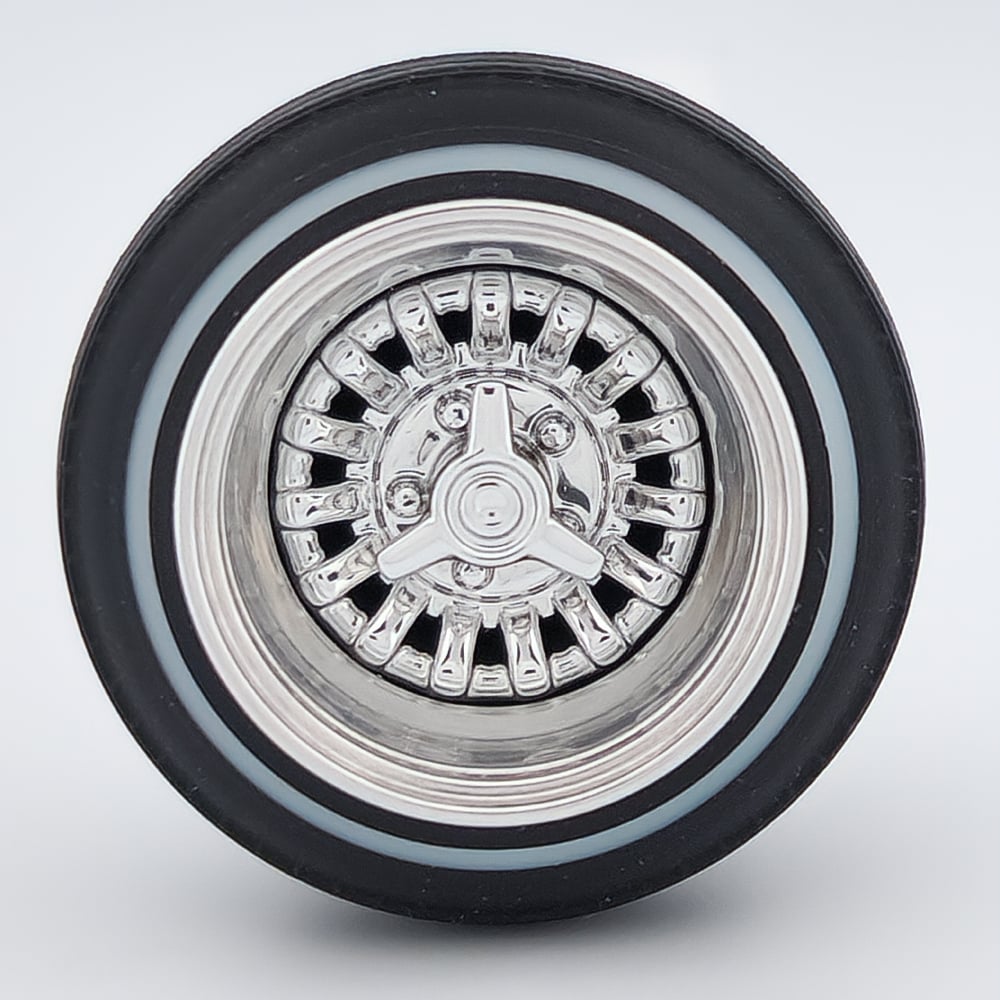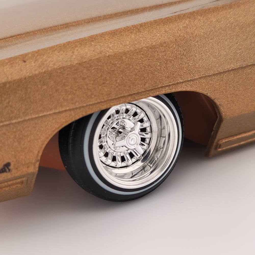 Set of four 14 inch 1:24-1:25 scale wheels with rubber 520 tires. Rims are aluminum and will require polishing by you. Available in all chrome or with gold center. Please use drop down menu to make selection.