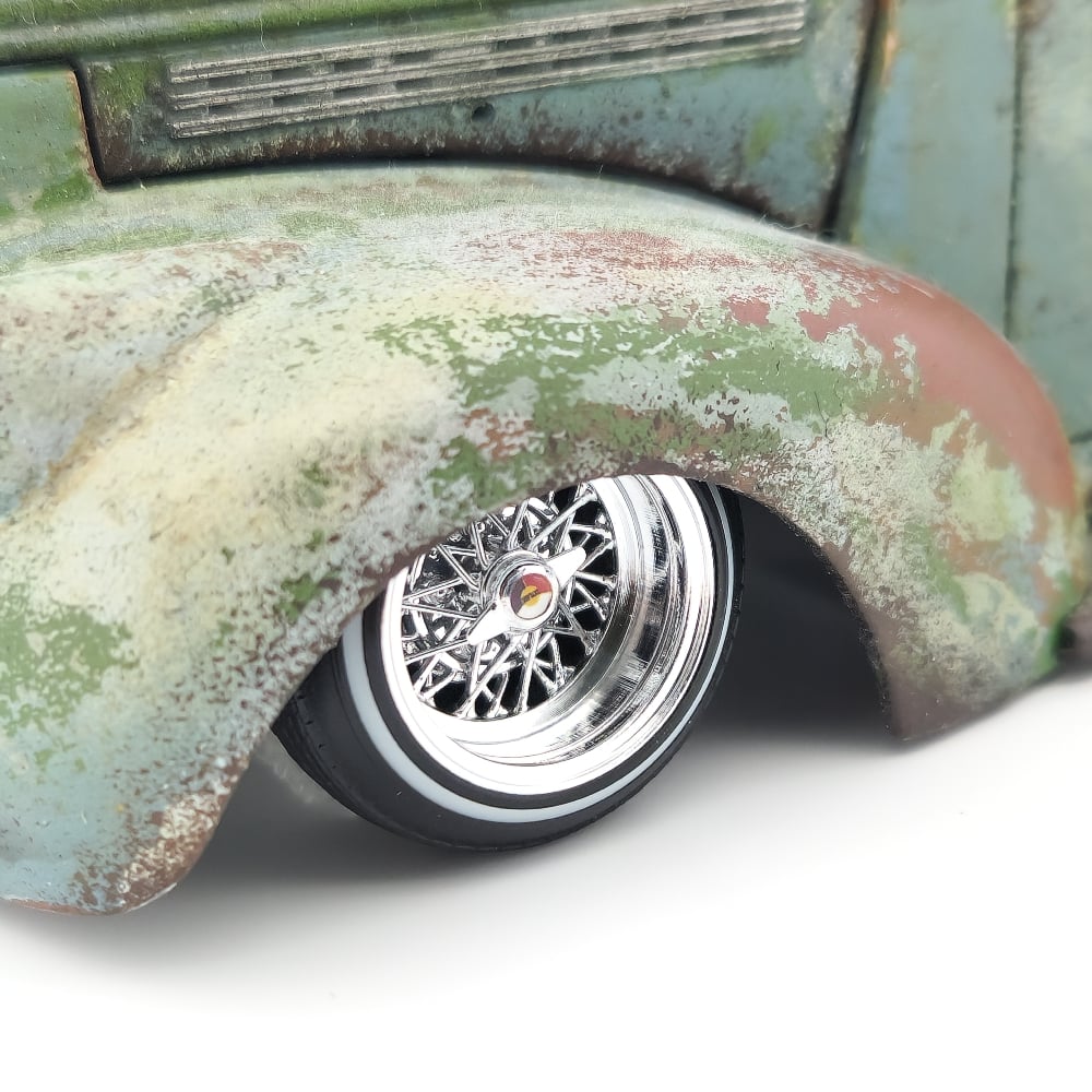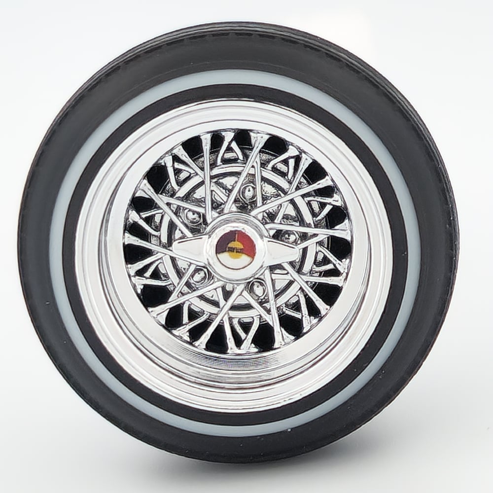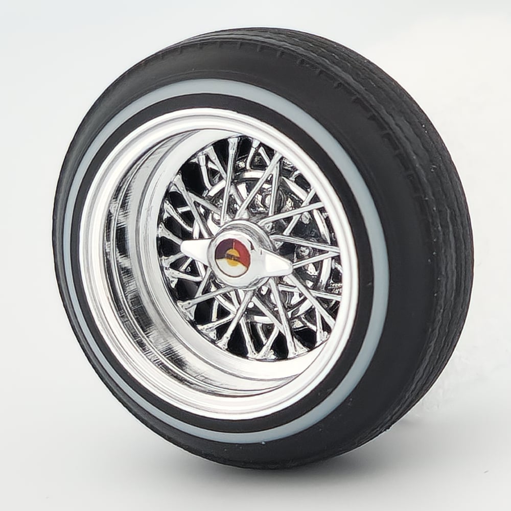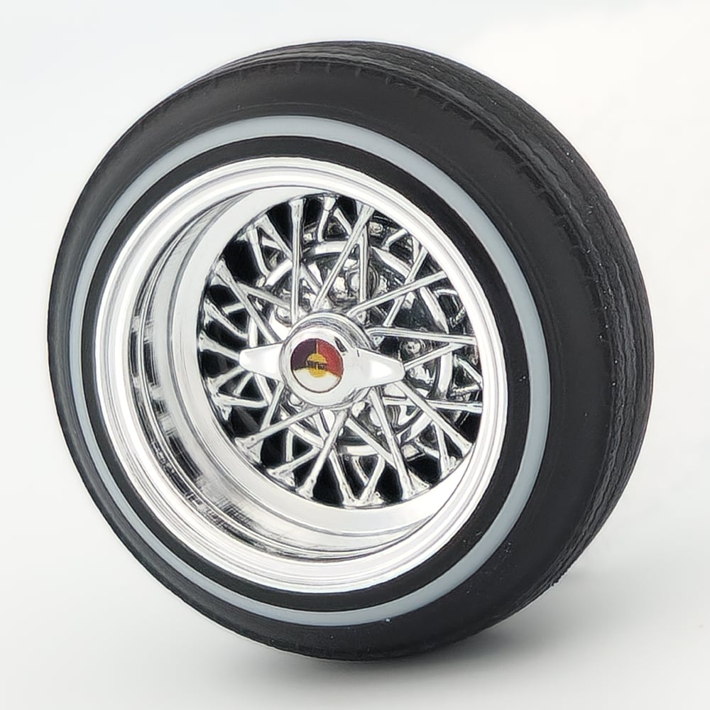 Set of four chrome plated 1:24-1:25 scale 14 inch spokes wrapped in rubber whitewall tires. Free die cut water slide chip decals are included. Back side of wheels are not plated.