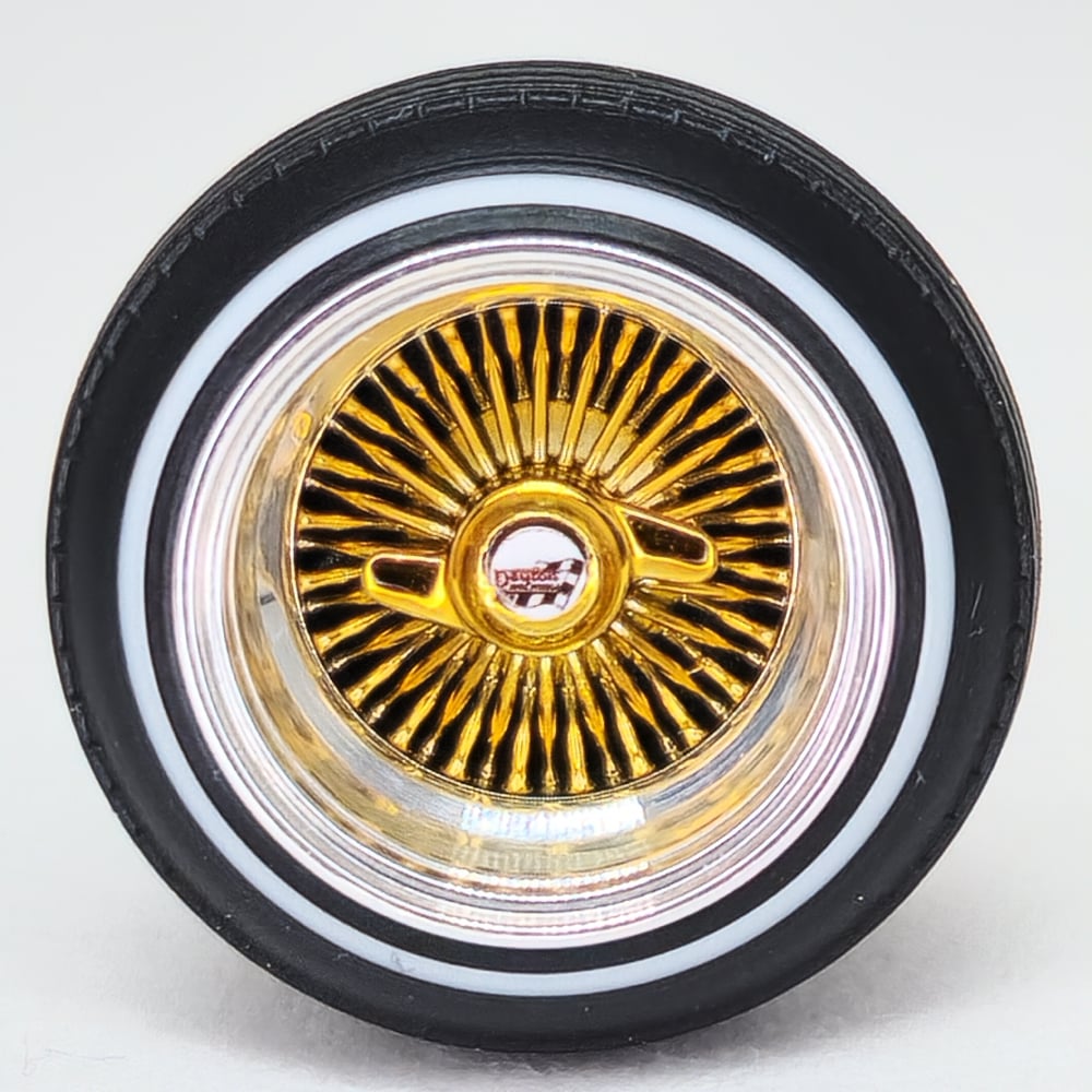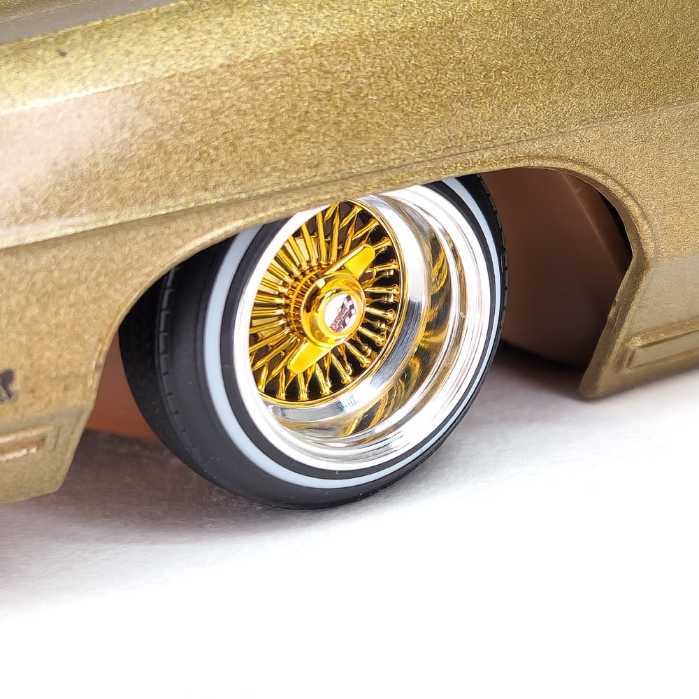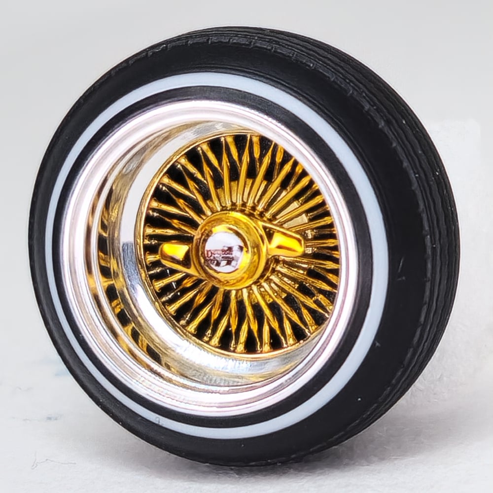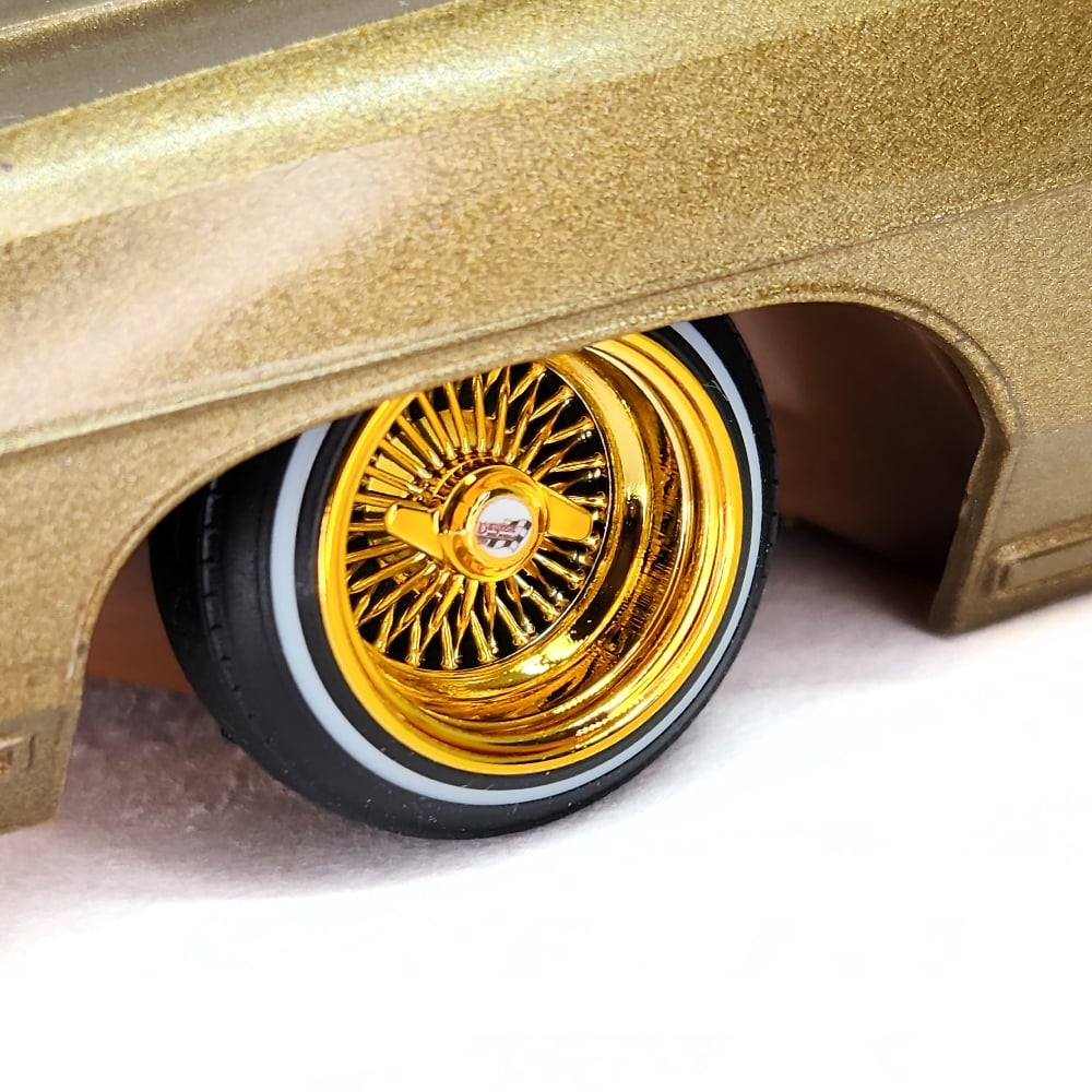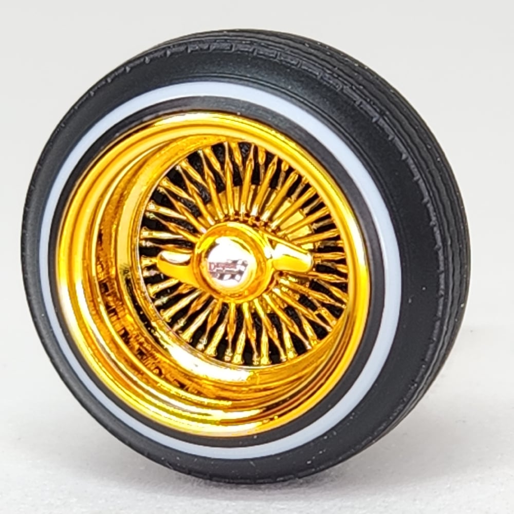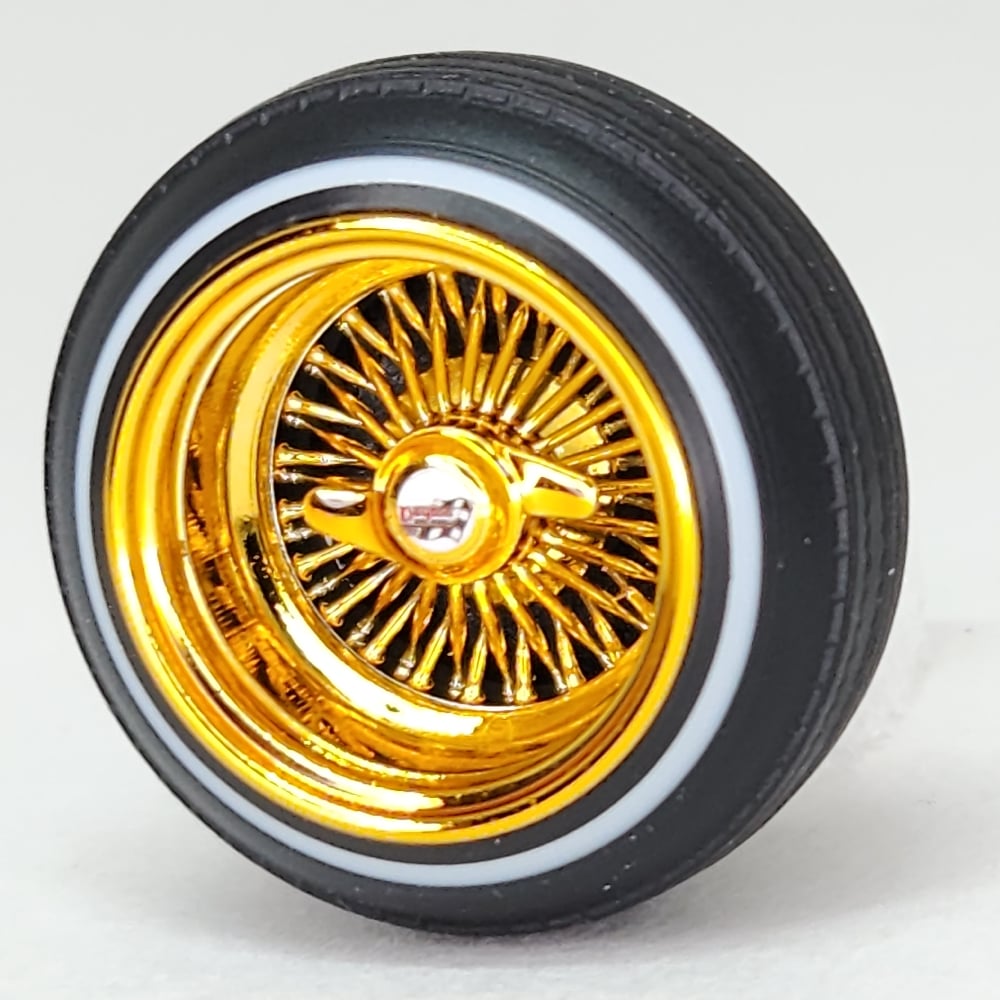 Set of 4 chrome or gold plated 1:24-1:25 scale 14 inch straight lace wire wheels with rubber whitewall tires. These were designed to be very durable and difficult to break. Will work just fine on hoppers. Available in 3 different knock off options. Hex cap, bullet cap, and 2 bar knock offs. 2 tone version comes with gold knock offs. KO options include free die cut water slide chip decals. Back side of wheels are not plated. Sets including aluminum rims require polishing. Please use drop down menu to make selection.