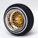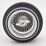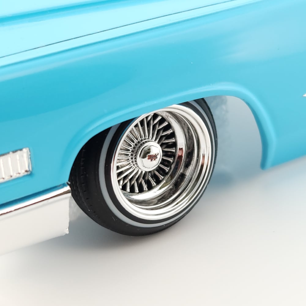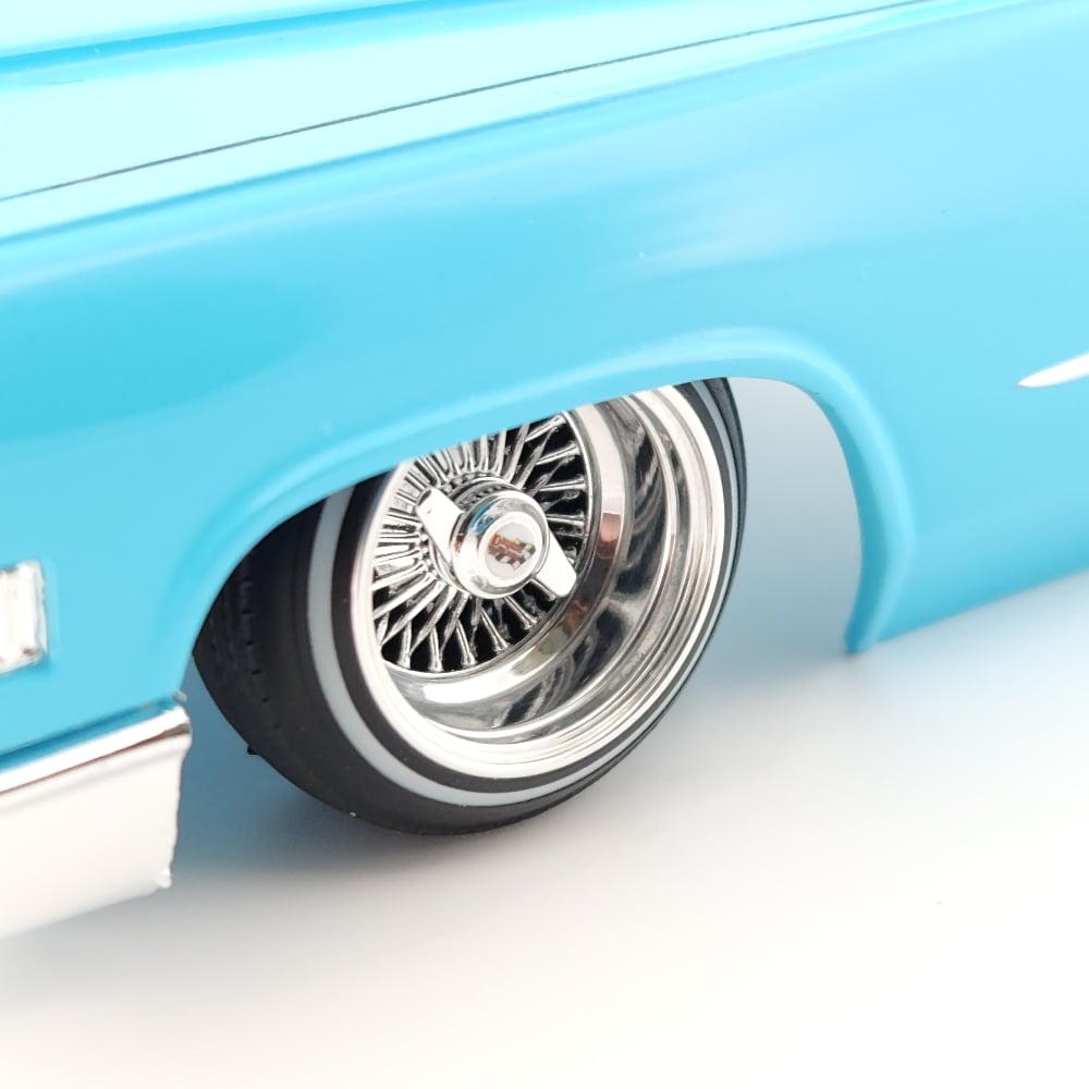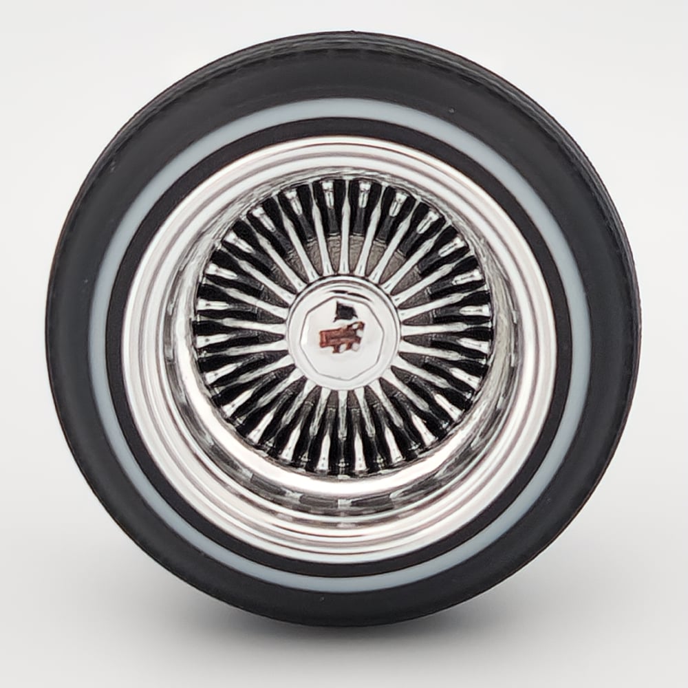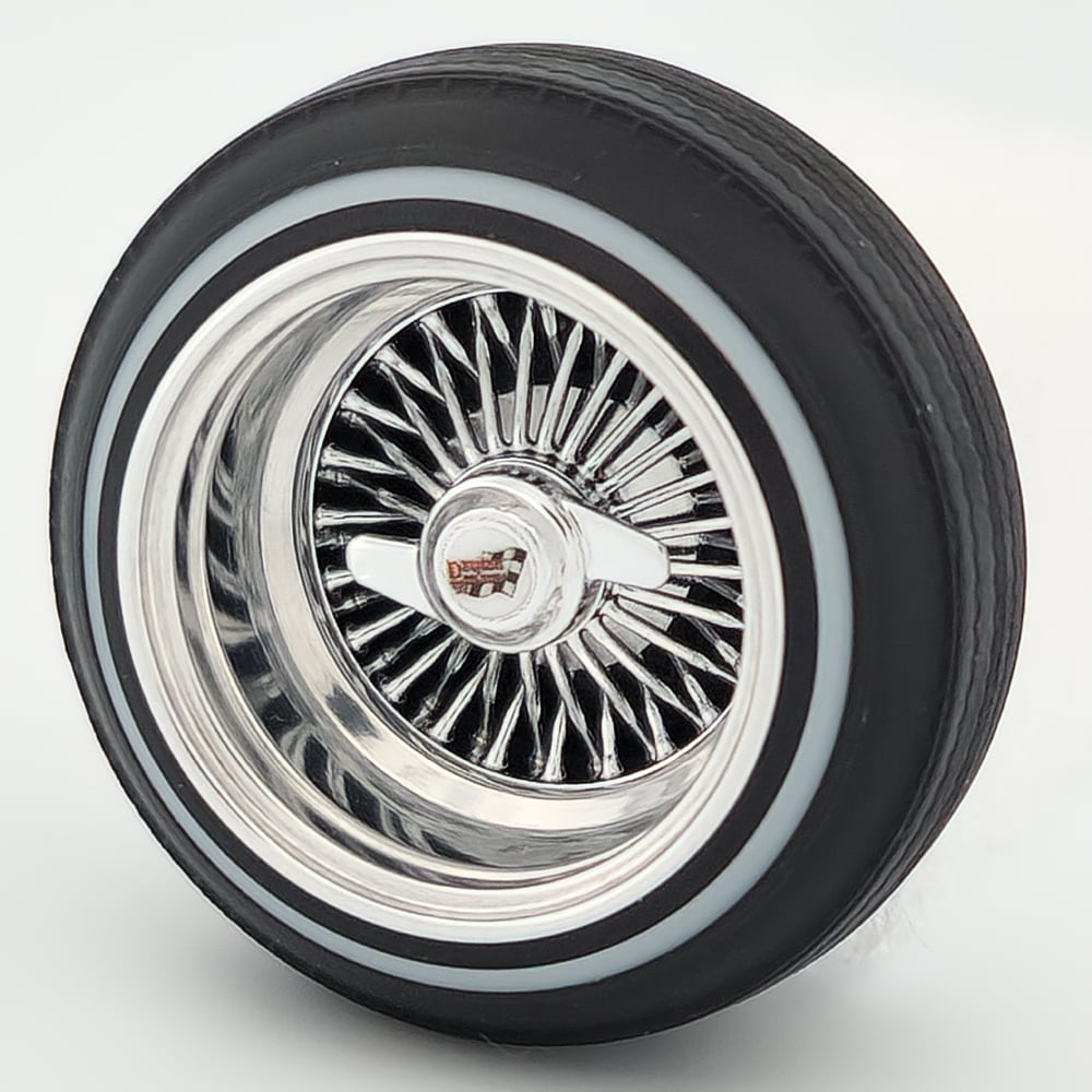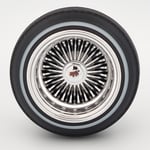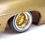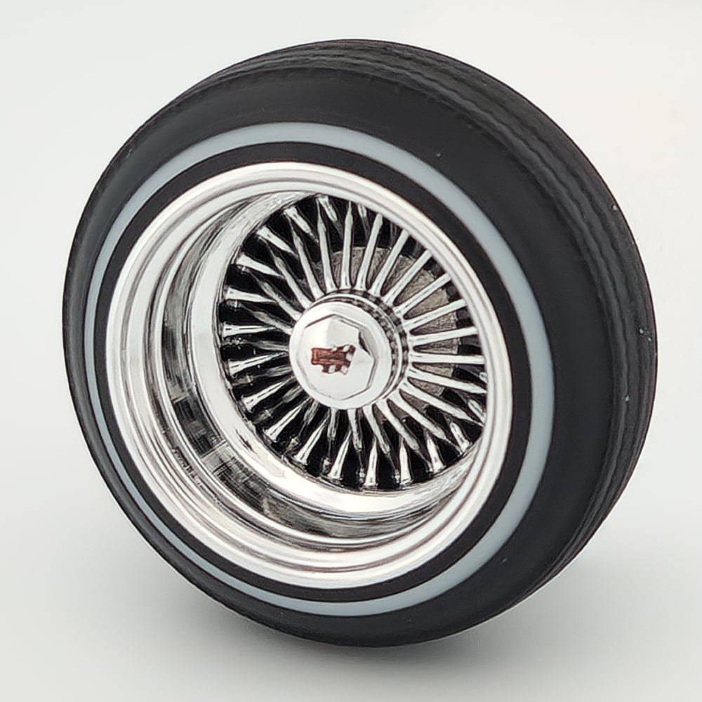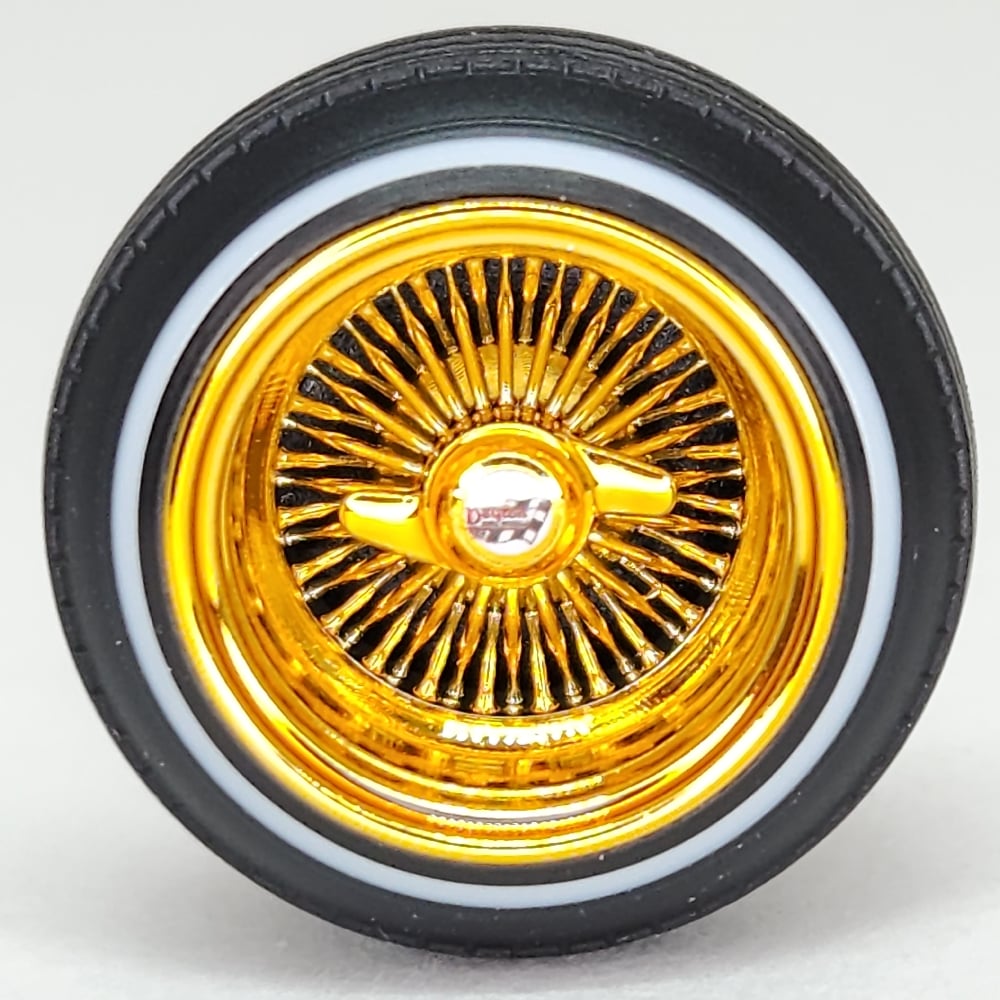 Set of 4 chrome or gold plated 1:24-1:25 scale 14 inch straight lace wire wheels with rubber whitewall tires. These were designed to be very durable and difficult to break. Will work just fine on hoppers. Available in 3 different knock off options. Hex cap, bullet cap, and 2 bar knock offs. 2 tone version comes with gold knock offs. KO options include free die cut water slide chip decals. Back side of wheels are not plated. Sets including aluminum rims require polishing. Please use drop down menu to make selection.