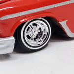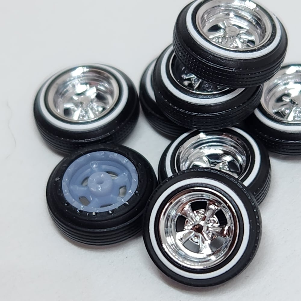 Two sets (8 pieces) of 1:64 scale chrome plated spoke wheels with plastic 520 whitewall tires. Assembled as seen in the pictures. Might need some adjustments to the back side to mount to your particular build. Back sides of wheels are not plated.