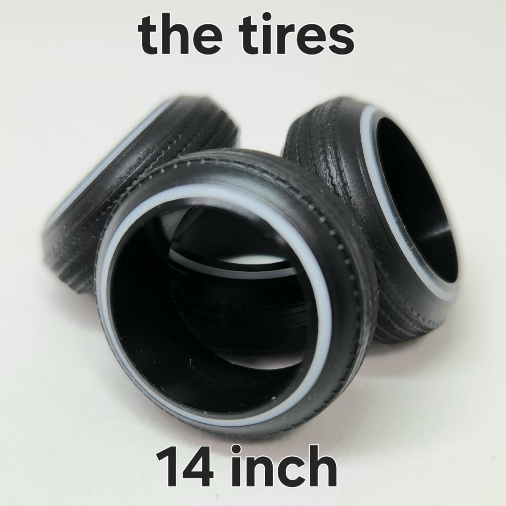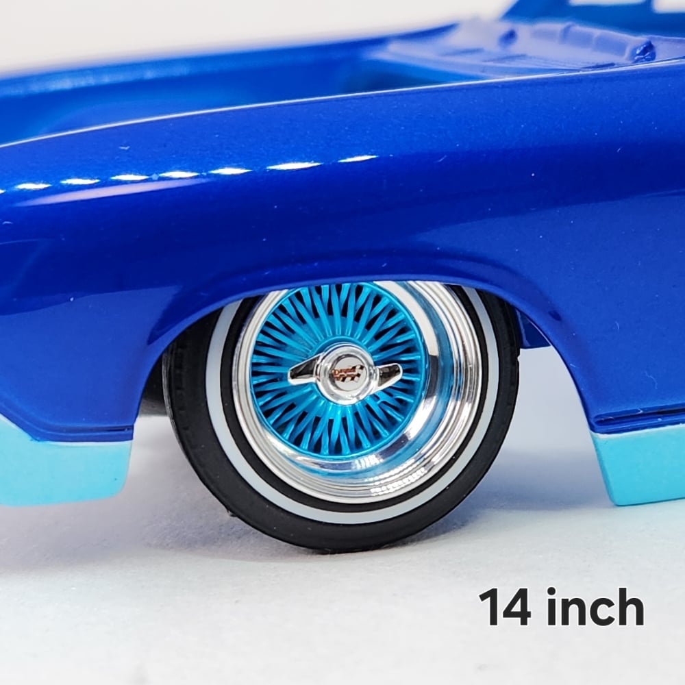 Set of four 1:24-1:25 scale 13 or 14 inch straight lace spokes with rubber whitewall tires. These are designed for painting spokes the color of your choice. Spokes section is raw resin for painting. Rims are aluminum (you will need to polish yourself) and 2 bar knock offs are chrome plated. Free white die cut water slide chips decals included. Colored chips sold separately. Back side of wheels are not plated. Use drop down menu to select size.
