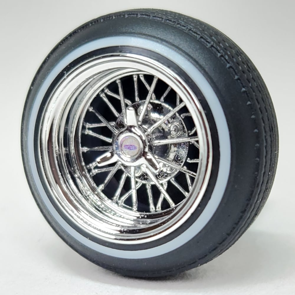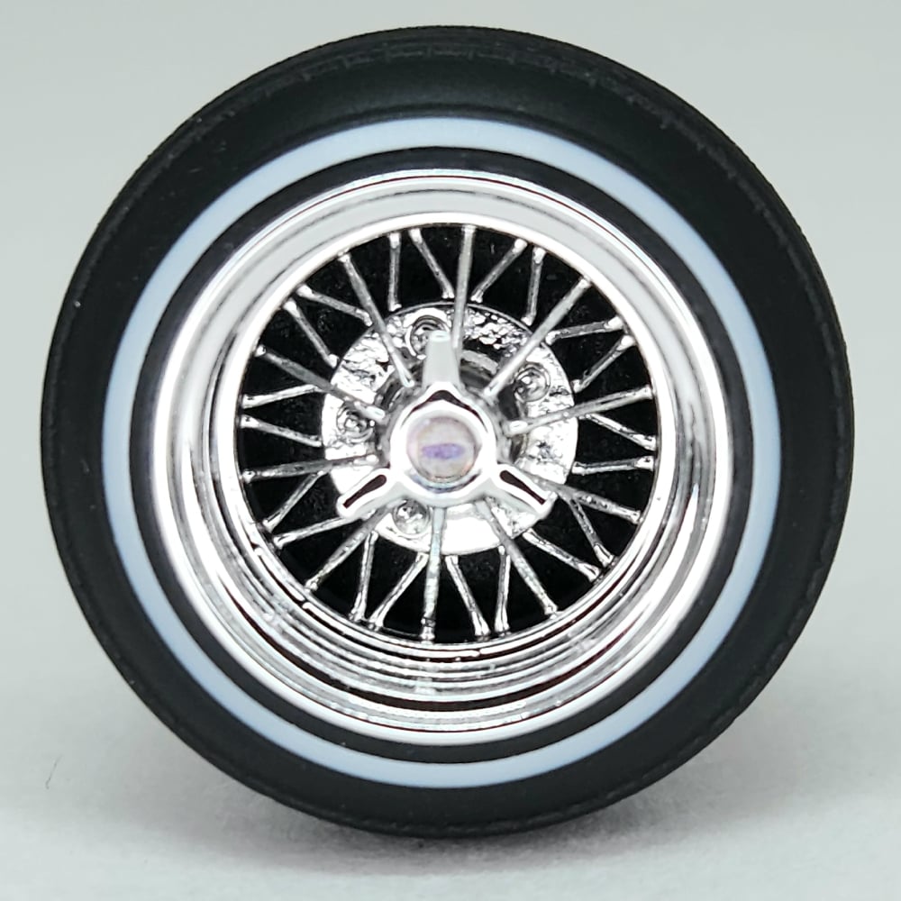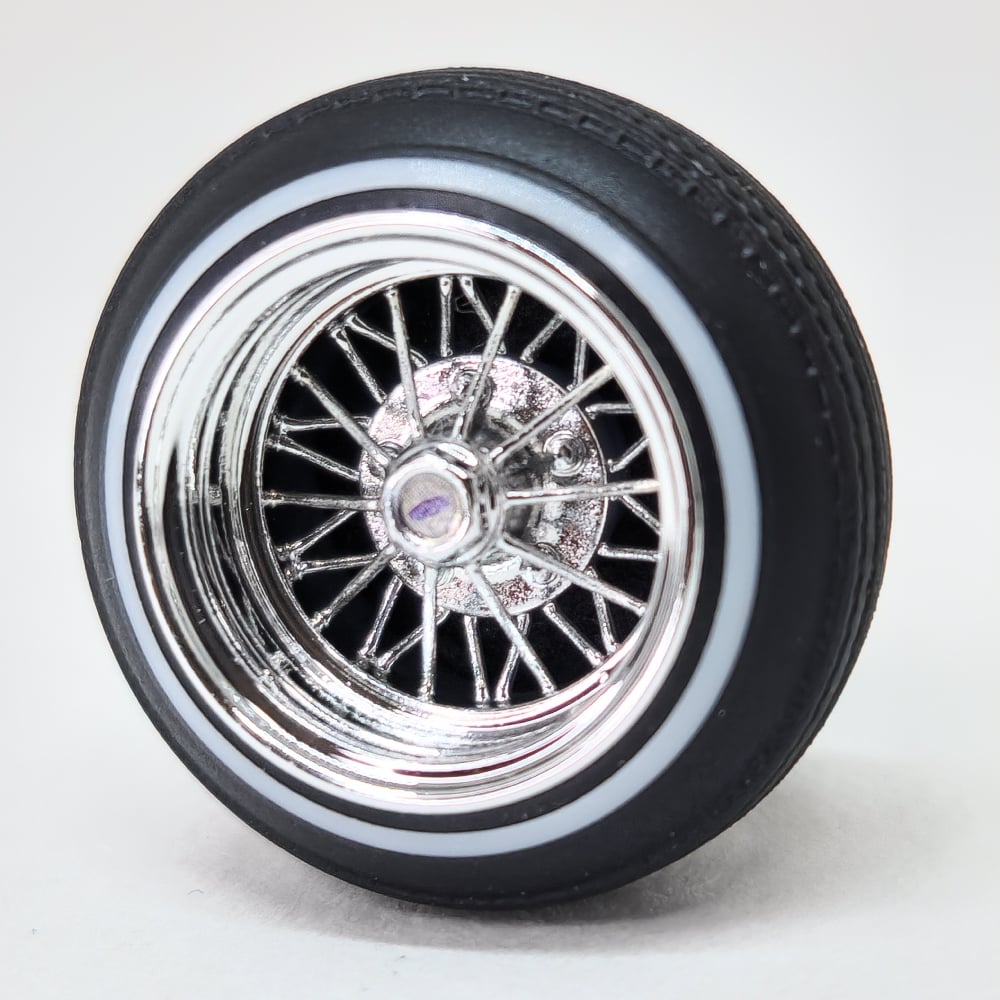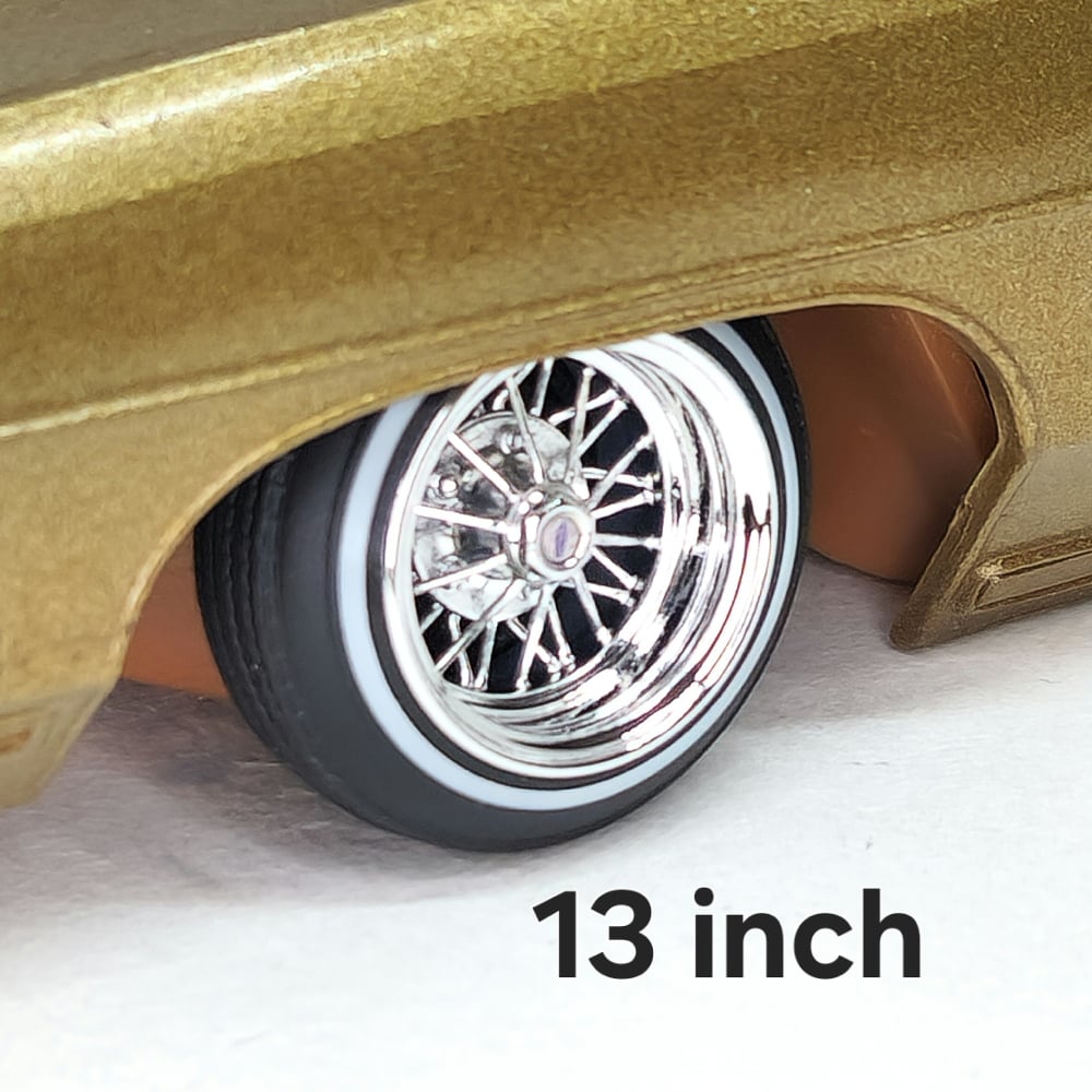Set of four 1:24-1:25 scale chrome or gold plated 30 spoke wire wheels with rubber whitewall 520 tires. Free die cut water slide chip decals included with all. chrome available in 13 or 14 inch. Chrome are $35, gold are $45. Back side of wheels are not plated. Please use drop down menu to make selection.
