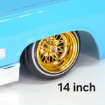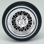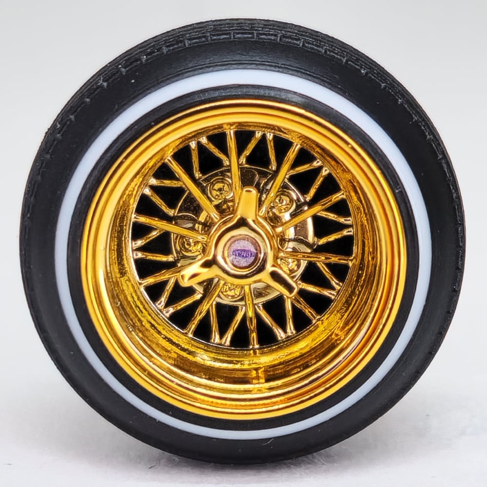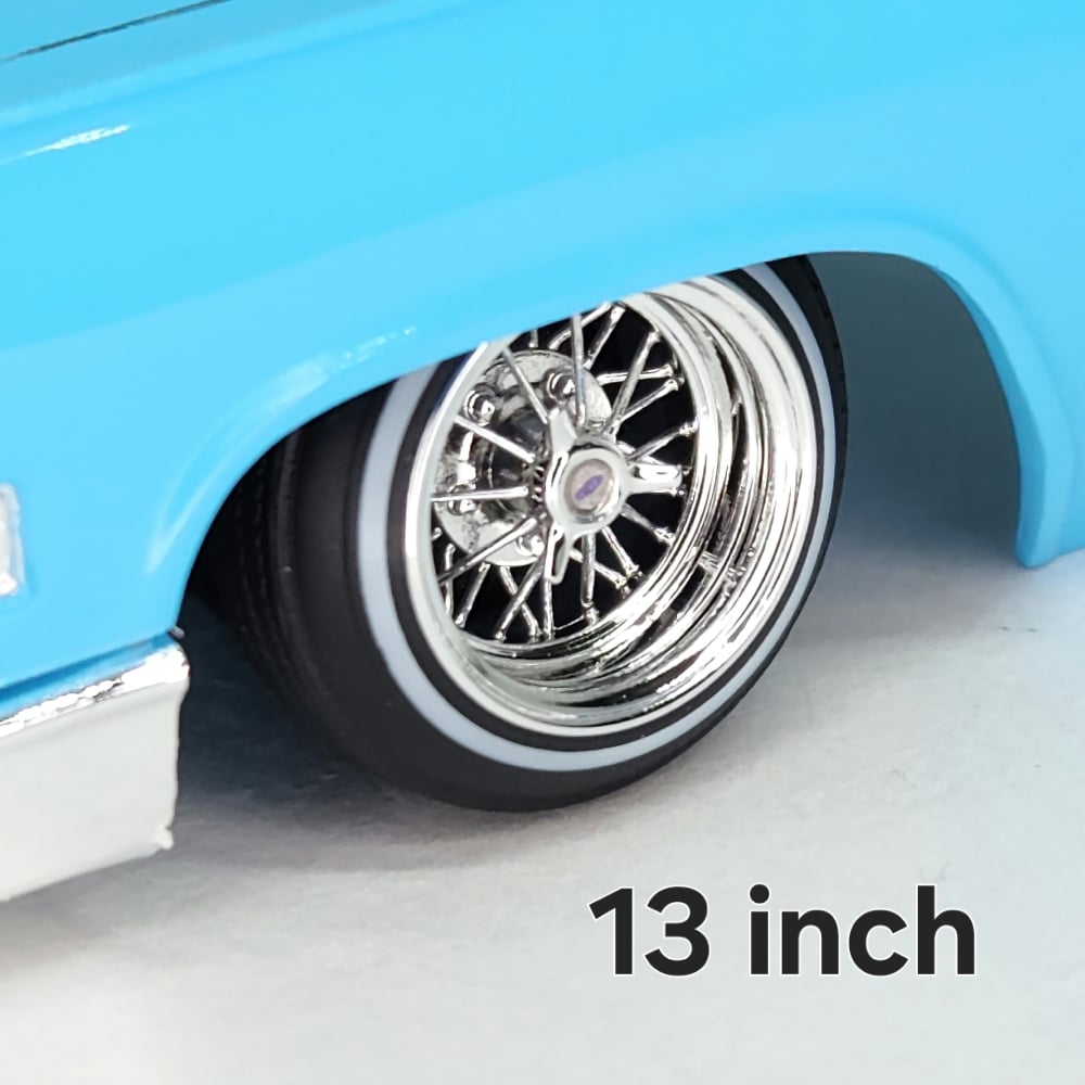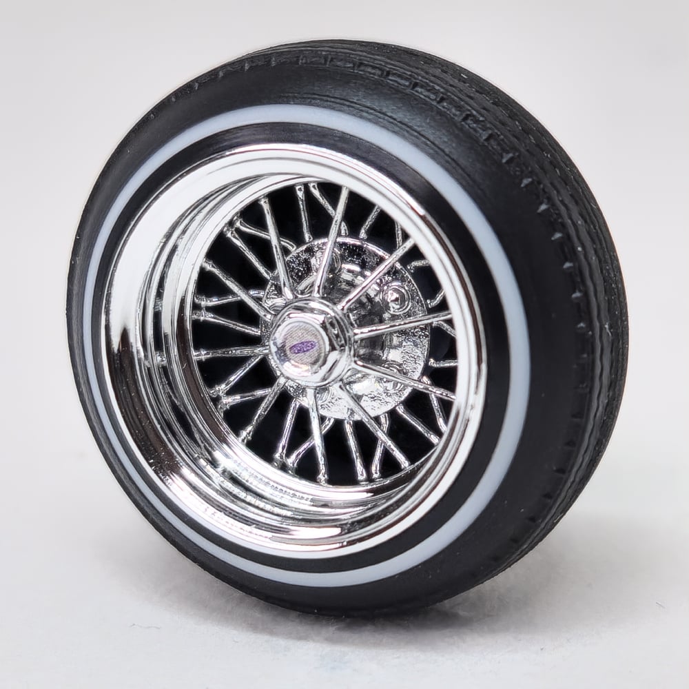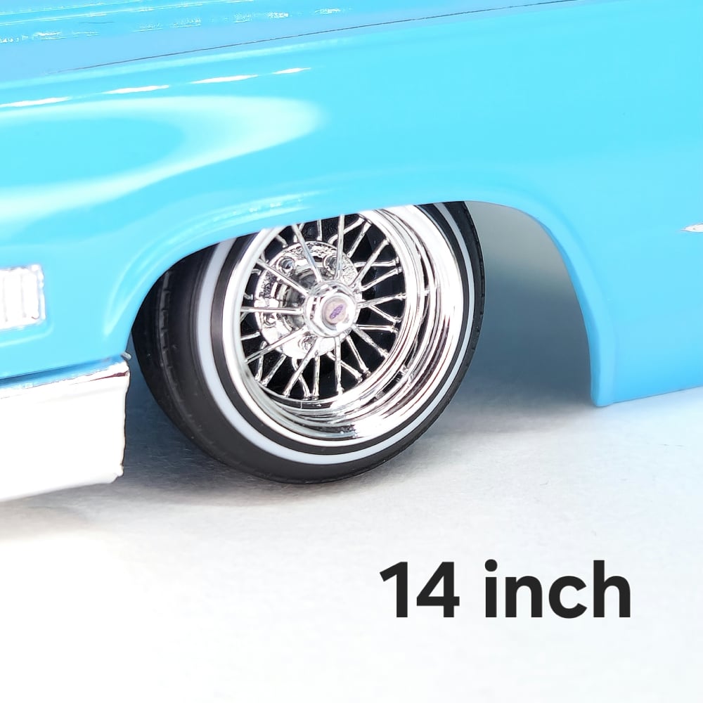 Set of four 1:24-1:25 scale chrome or gold plated 30 spoke wire wheels with rubber whitewall 520 tires. Free die cut water slide chip decals included with all. chrome available in 13 or 14 inch. Chrome are $35, gold are $45. Back side of wheels are not plated. Please use drop down menu to make selection.