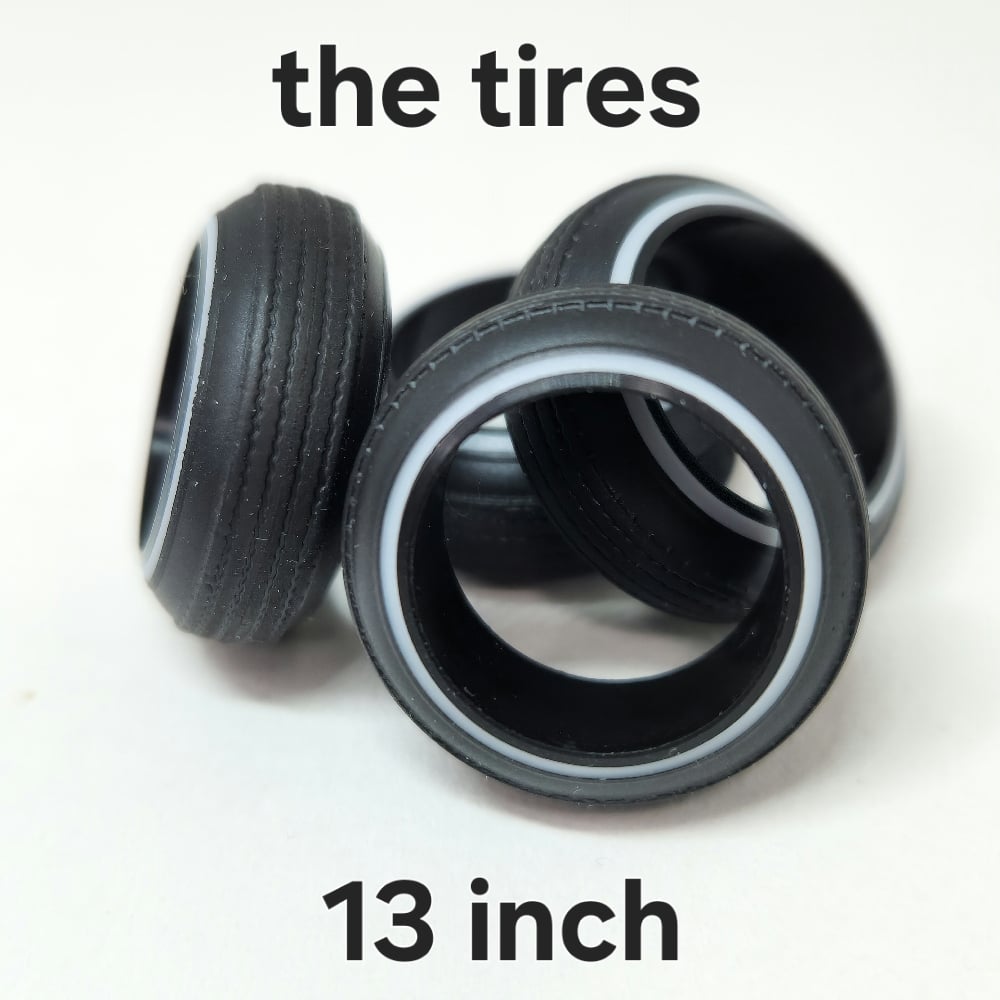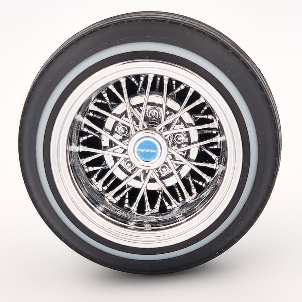 Set of four 1:24-1:25 scale chrome plated 45 spoke wire wheels with rubber whitewall tires. Redesigned for strength compared to previous version. Available in 13 and 14 inch, as well as round center cap or 3 bar knock off. Now include free die cut water slide chip decals. Back side of wheels are not plated. Please use drop down menu to make selection.