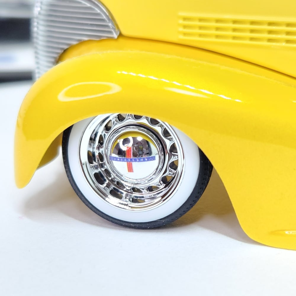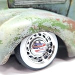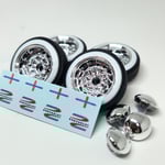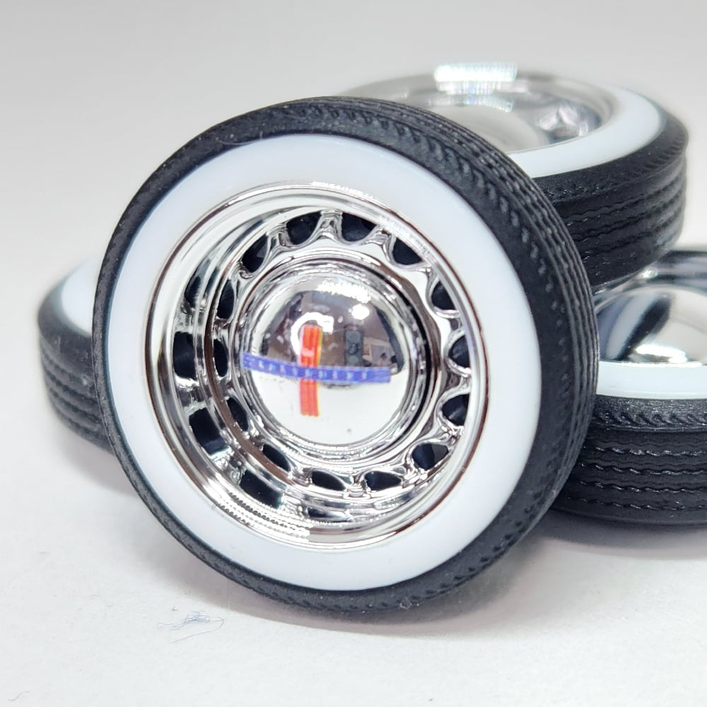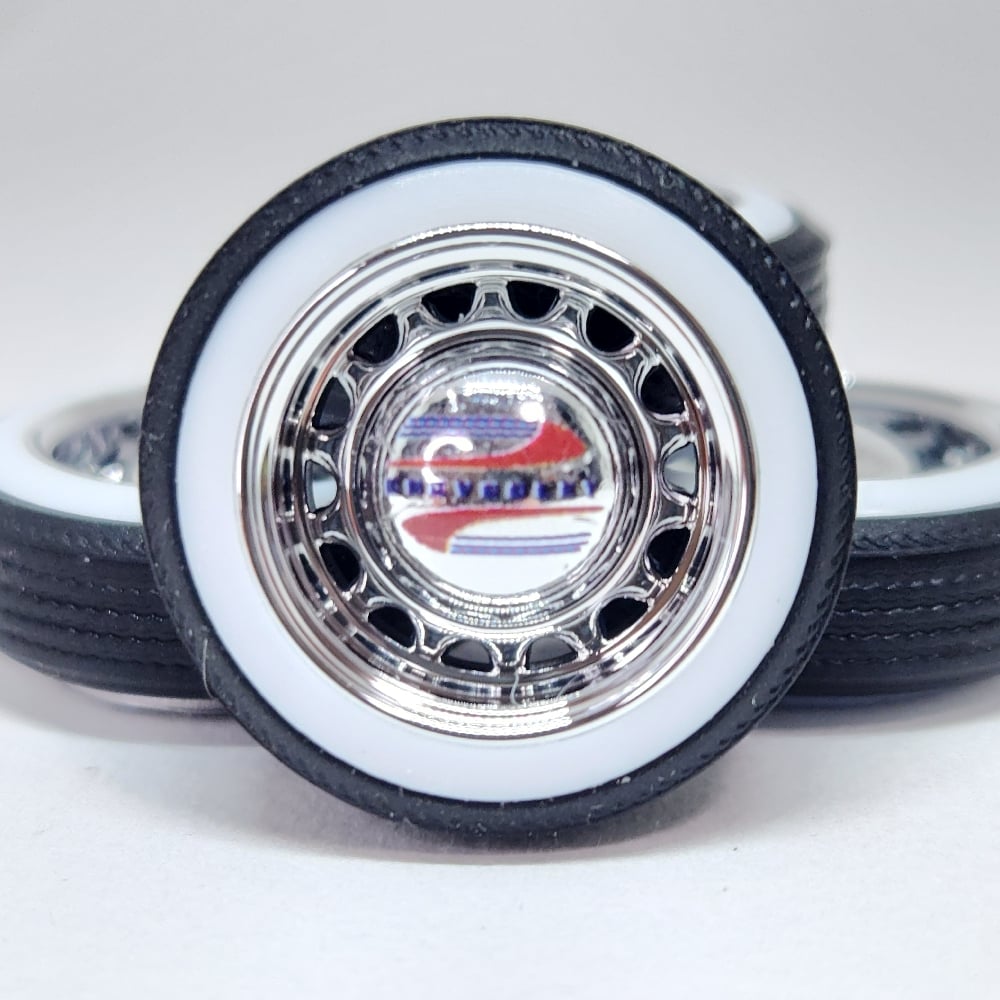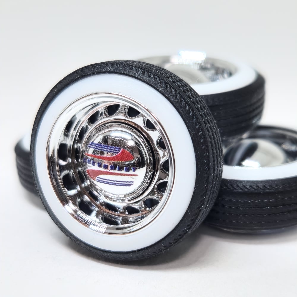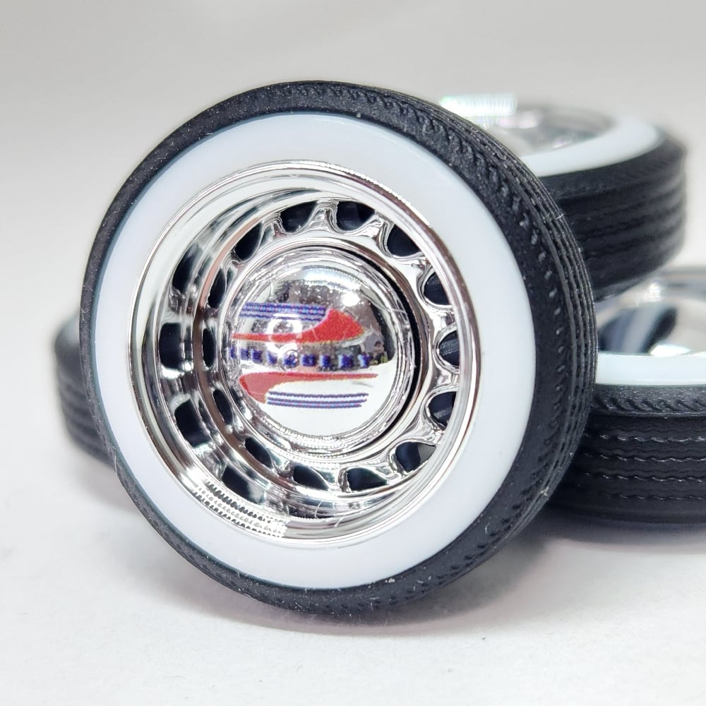 All original LMCP's 1:24-1:25 scale 15 inch artillery wheels with rubber wide white wall tires. Available in chrome plated or raw resin. Both options include chrome plated hubcaps. 2 free sets of die cut water slide decals included for the hubcaps. Outside diameter of rim is 17mm. Back side of wheels are not plated. Please use drop down menu to choose.