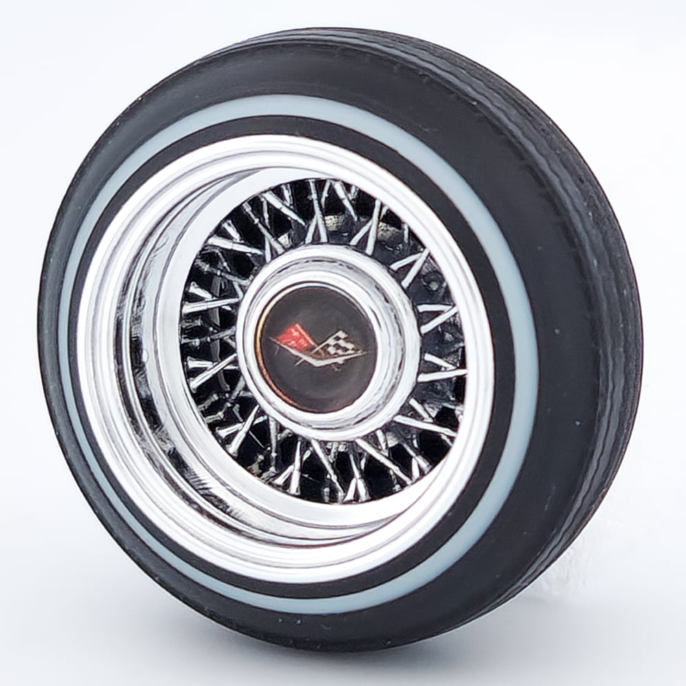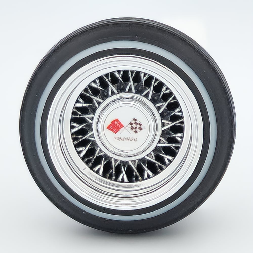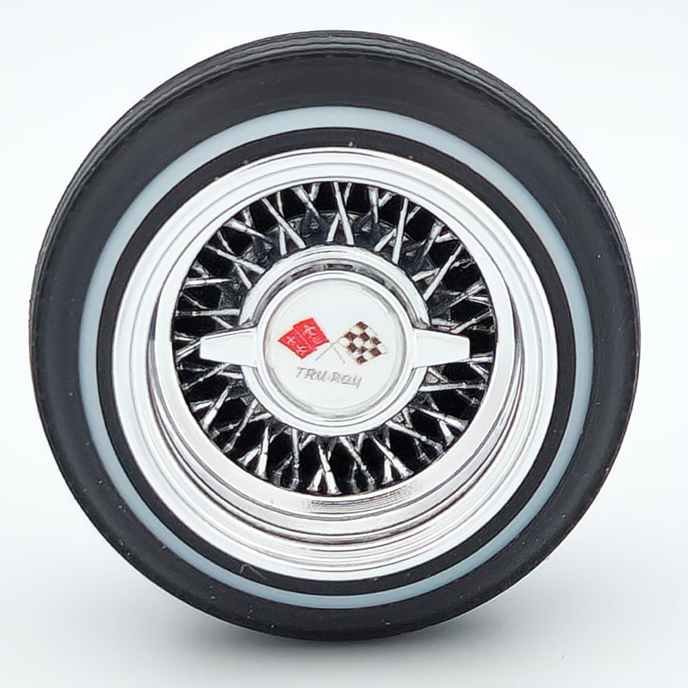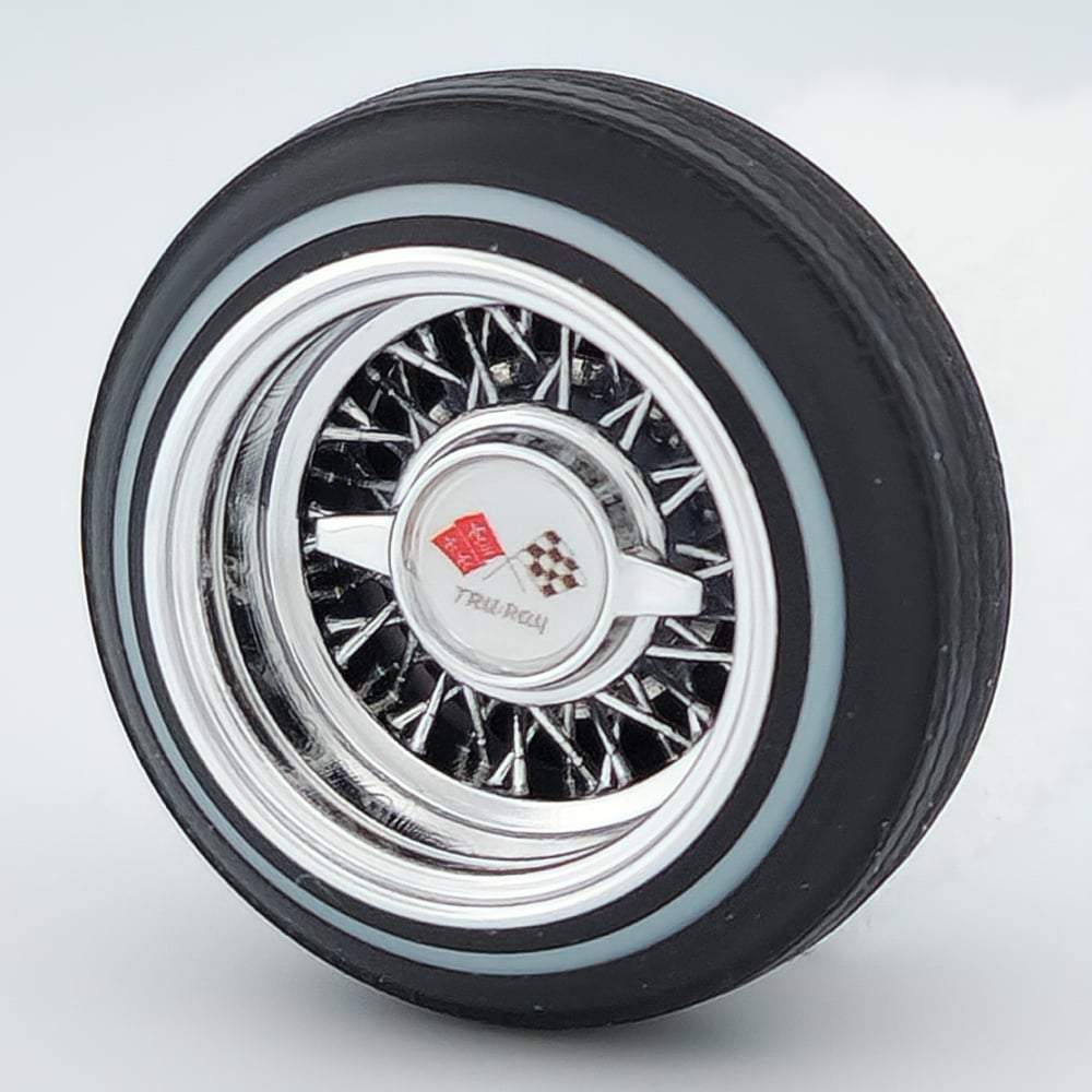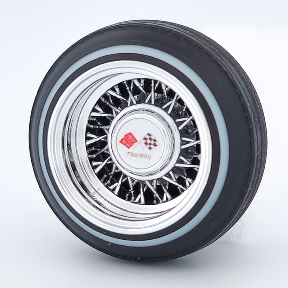 Set of four 1:24-1:25 scale chrome plated cross lace wire wheels with rubber whitewall tires. Free white and black die cut water slide decals included for the center caps. Available with round or knock off caps. Back side of wheels are not plated. Please use drop down menu to make selection.