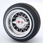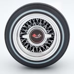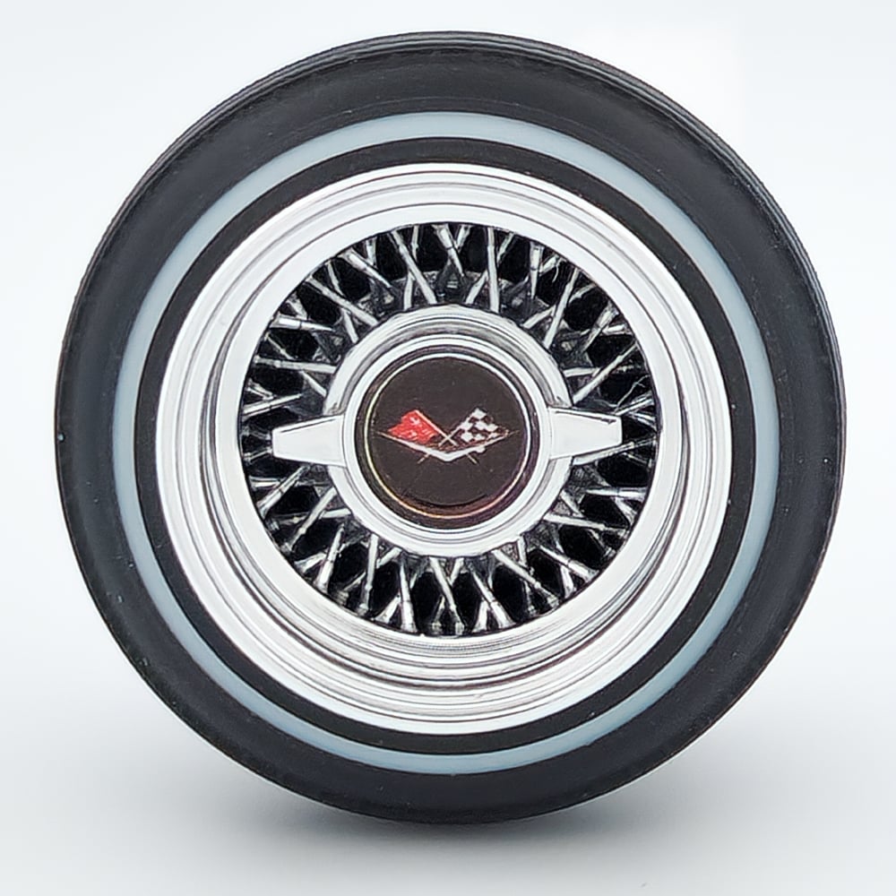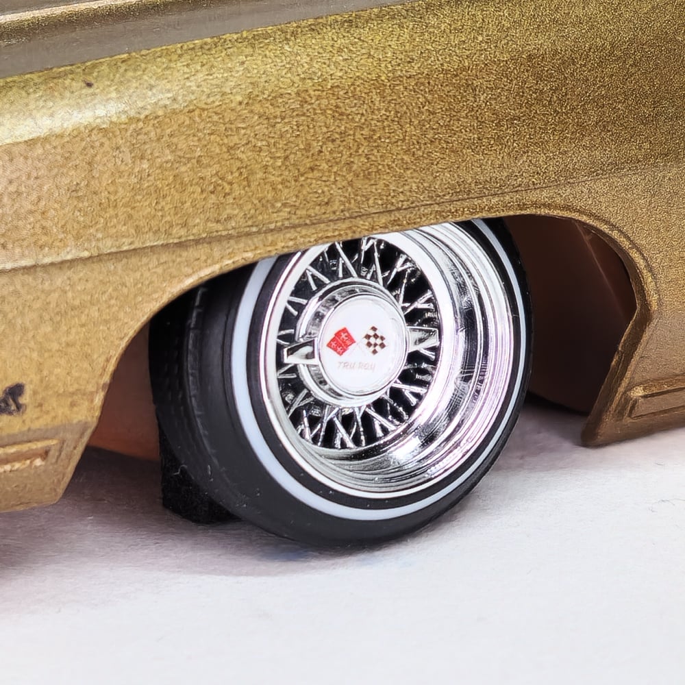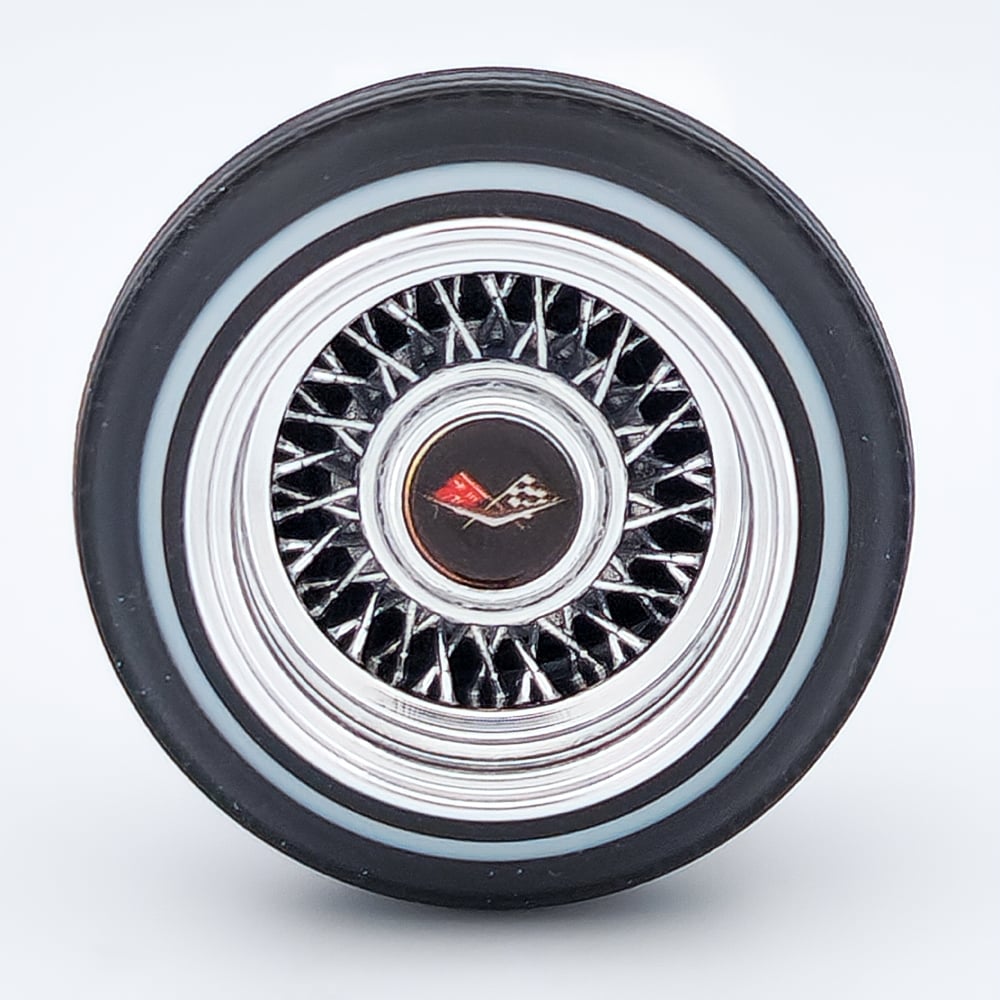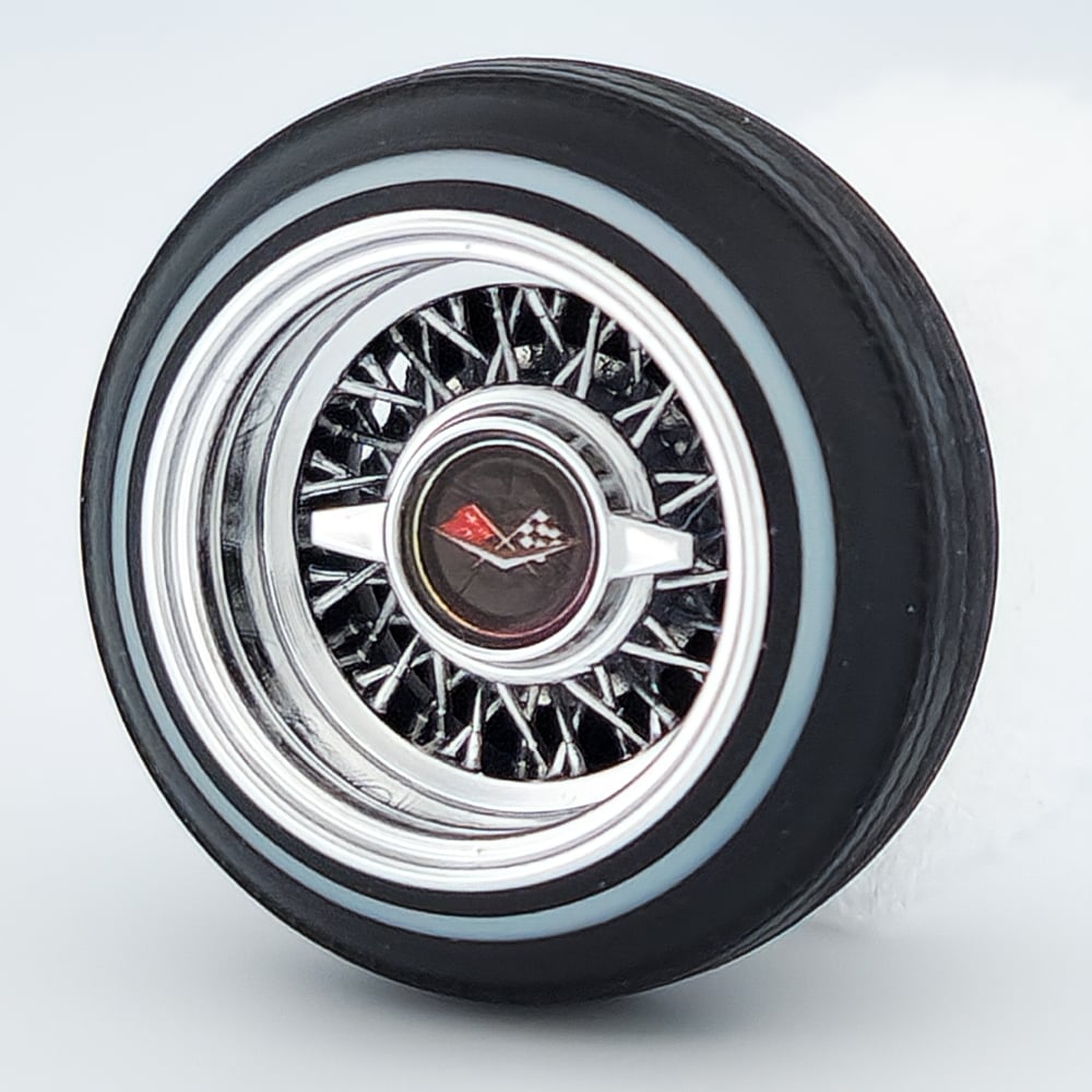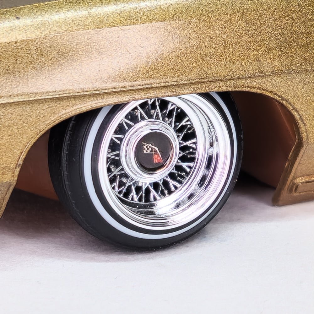 Set of four 1:24-1:25 scale chrome plated cross lace wire wheels with rubber whitewall tires. Free white and black die cut water slide decals included for the center caps. Available with round or knock off caps. Back side of wheels are not plated. Please use drop down menu to make selection.