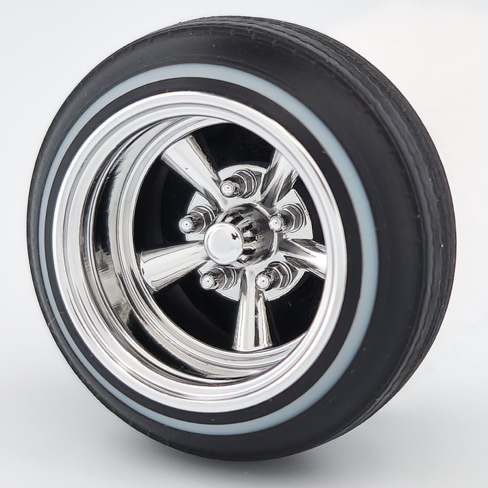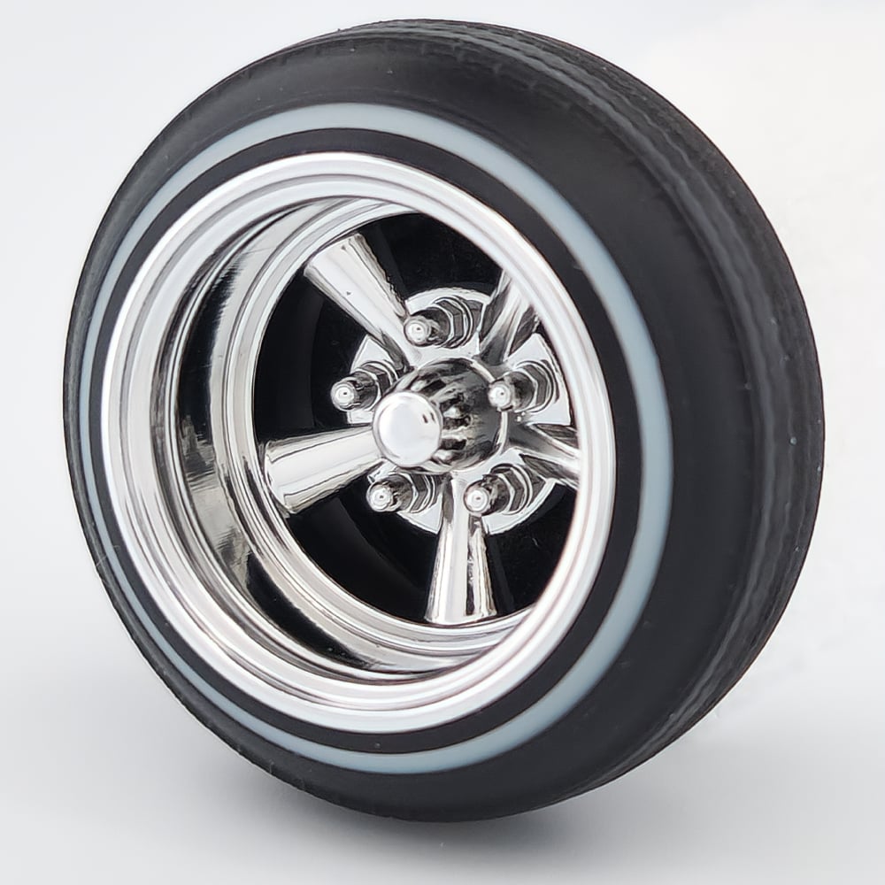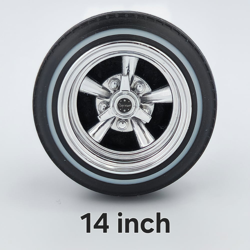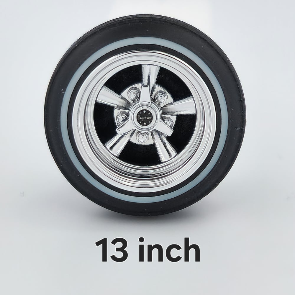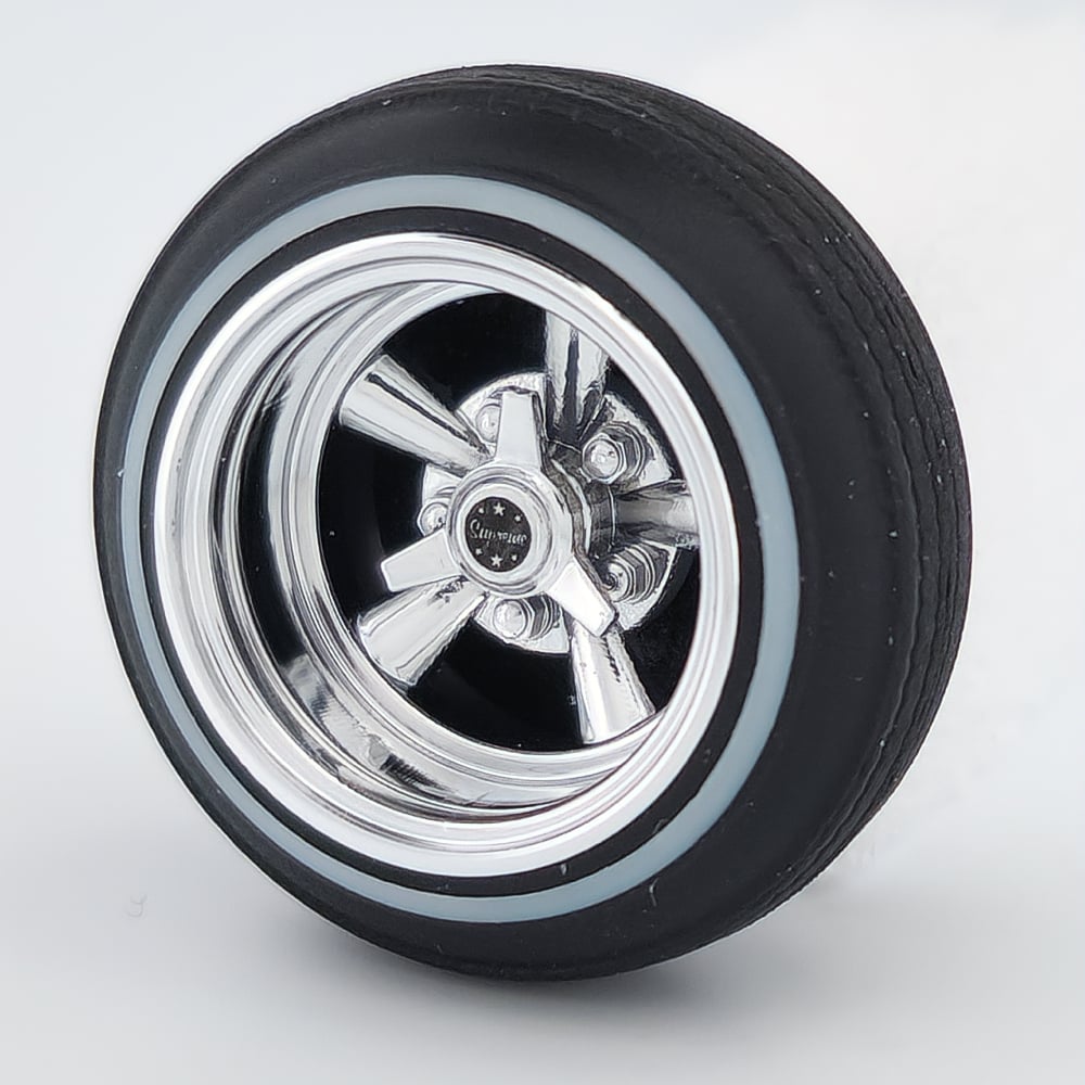 Set of four 1:24-1:25 scale chrome plated wheels with rubber whitewall tires. Available in 13 or 14 inch, round cap or 3 bar knock off. Knock off version includes free die cut water slide chip decals. Back side of wheels are not plated. Please use drop down menu to make selection.