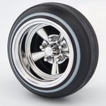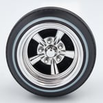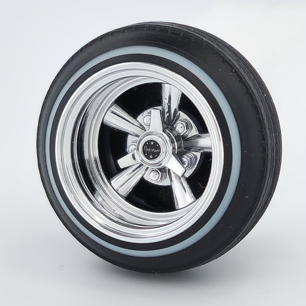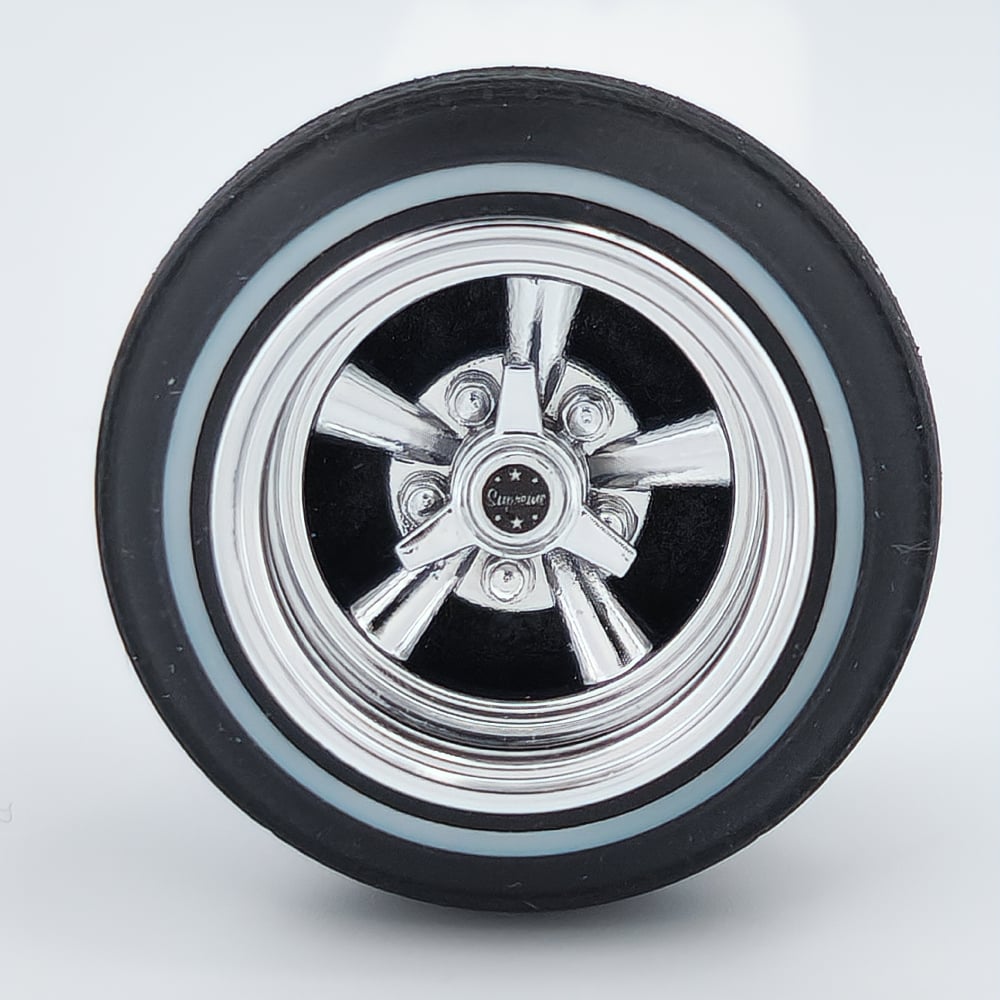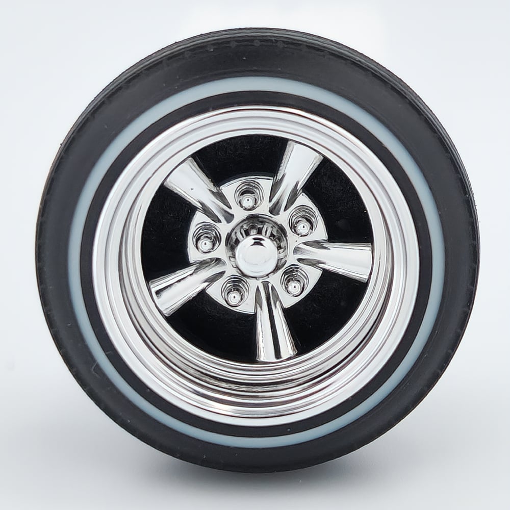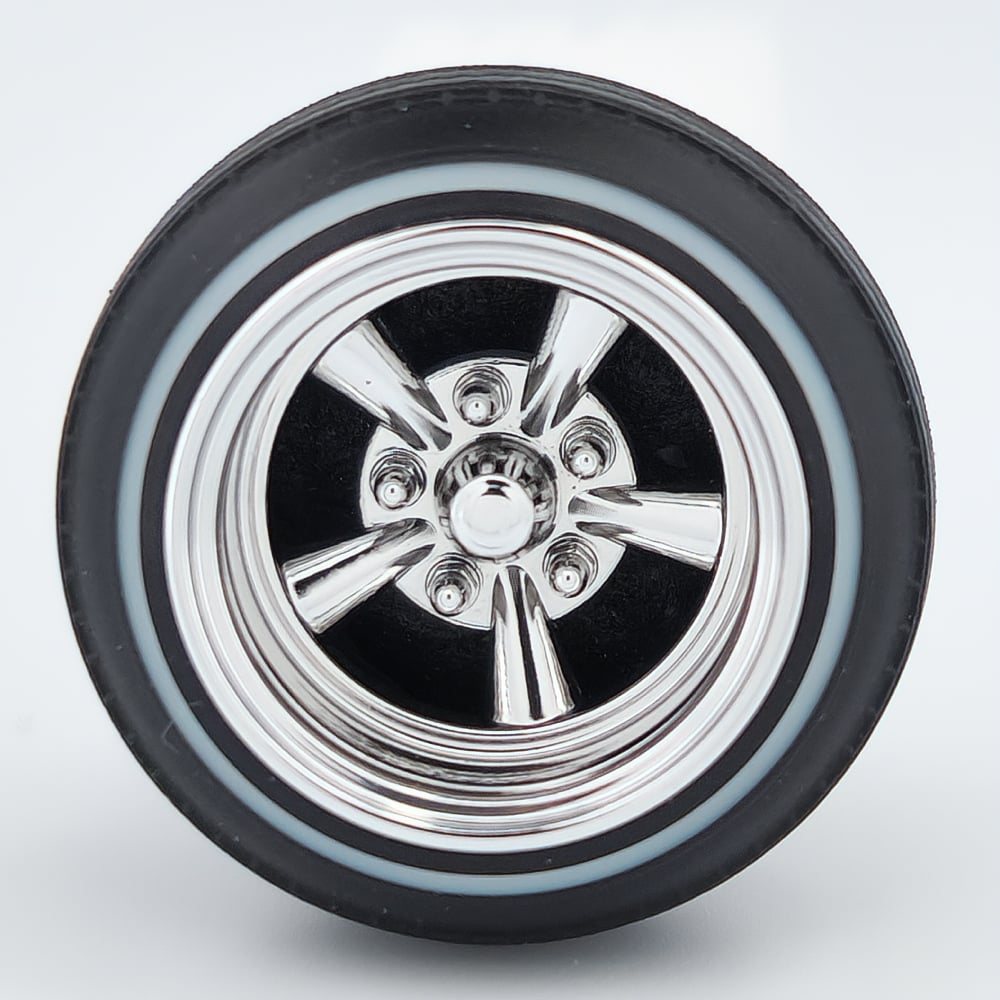 Set of four 1:24-1:25 scale chrome plated wheels with rubber whitewall tires. Available in 13 or 14 inch, round cap or 3 bar knock off. Knock off version includes free die cut water slide chip decals. Back side of wheels are not plated. Please use drop down menu to make selection.